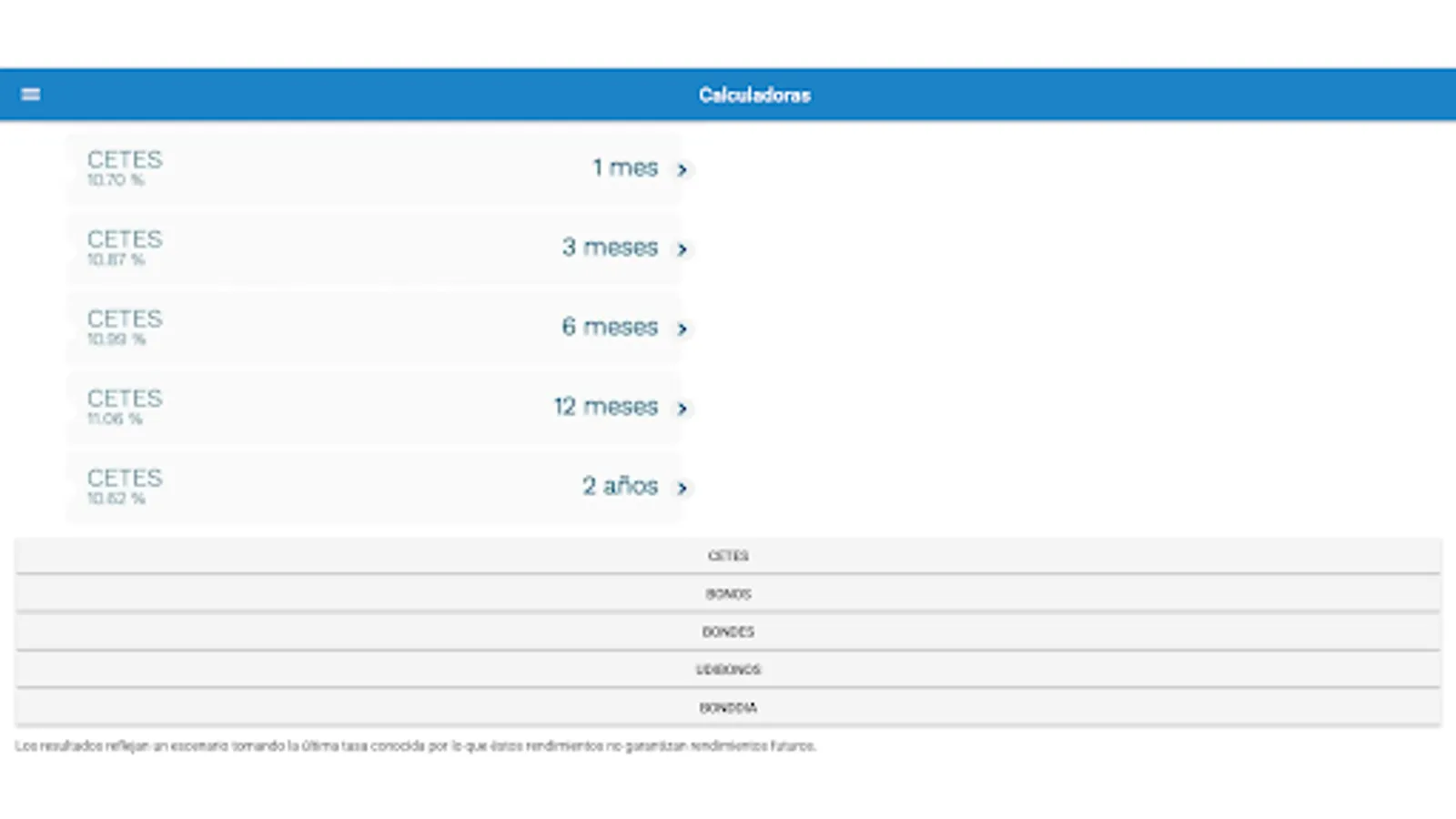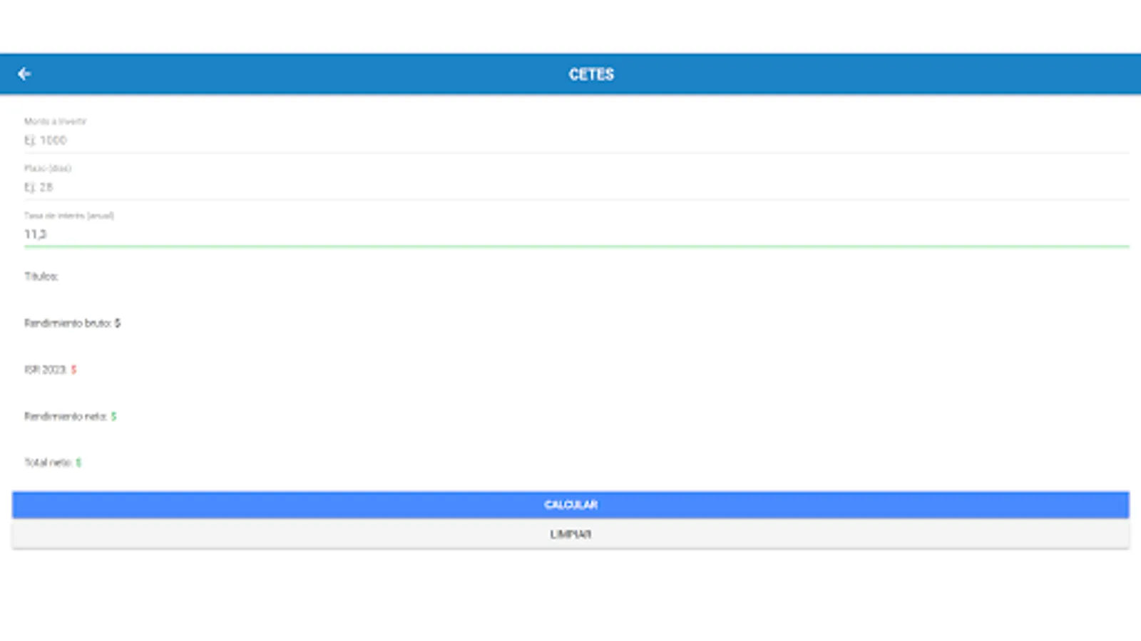 Welcome to the Cetes Calculator, your complete tool to maximize your investments in cetes, udibonos, bondes, bonds and bonddia! This state-of-the-art application offers you a comprehensive solution to calculate your earnings and increase your investment returns and an excellent alternative to direct cetes.