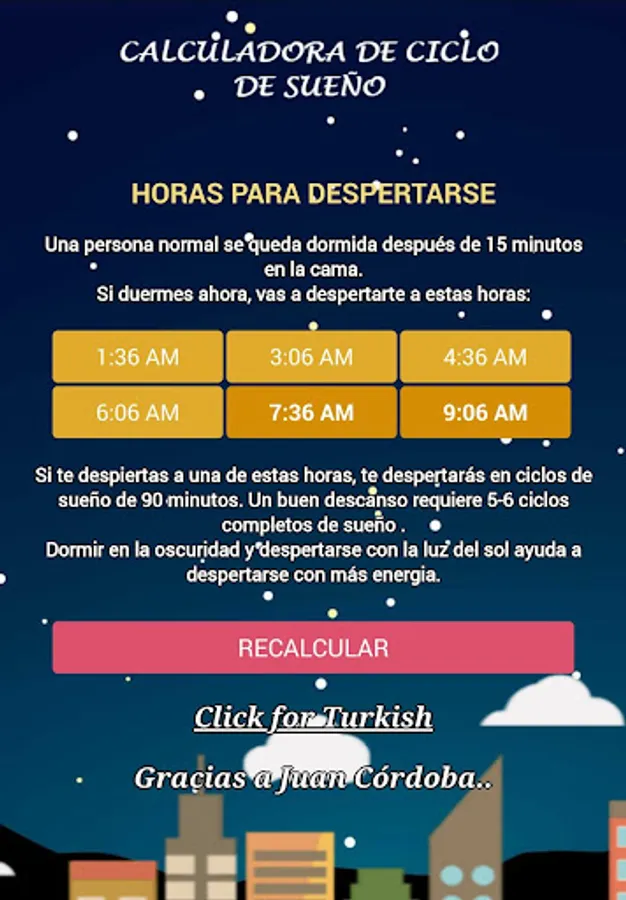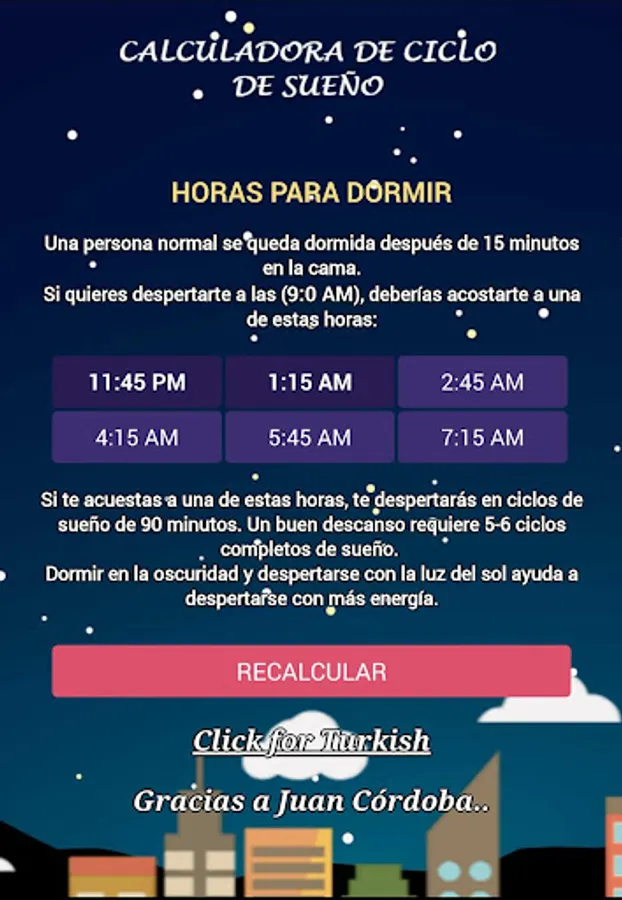 This application makes calculations and, once we indicate the time we want to wake up, it makes calculations backwards indicating the time to which it is better to go to bed and vice versa if you go to sleep at a certain time and you want to sleep only six hours (4 sleep cycles), that simple and useful.