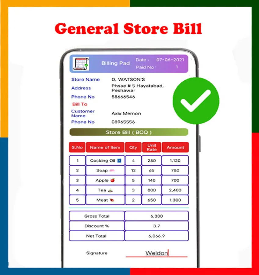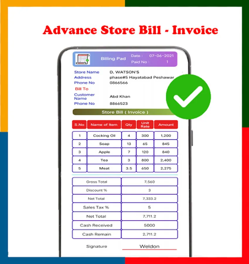 General store and medical store, owners can use this app to calculate the bill of costumer in a short interval of time, by just putting item quantity and unit rate, then the app automatically calculate the total cash, cash received, cash remains, tax, and discount. you can also print the calculated bill and share it as a pdf file instantly.