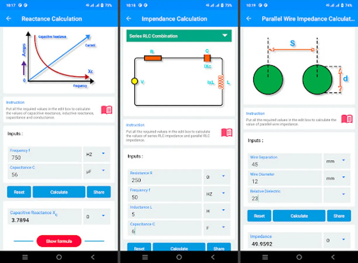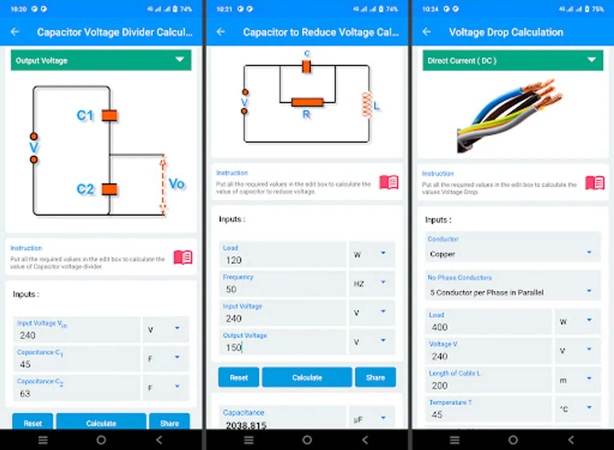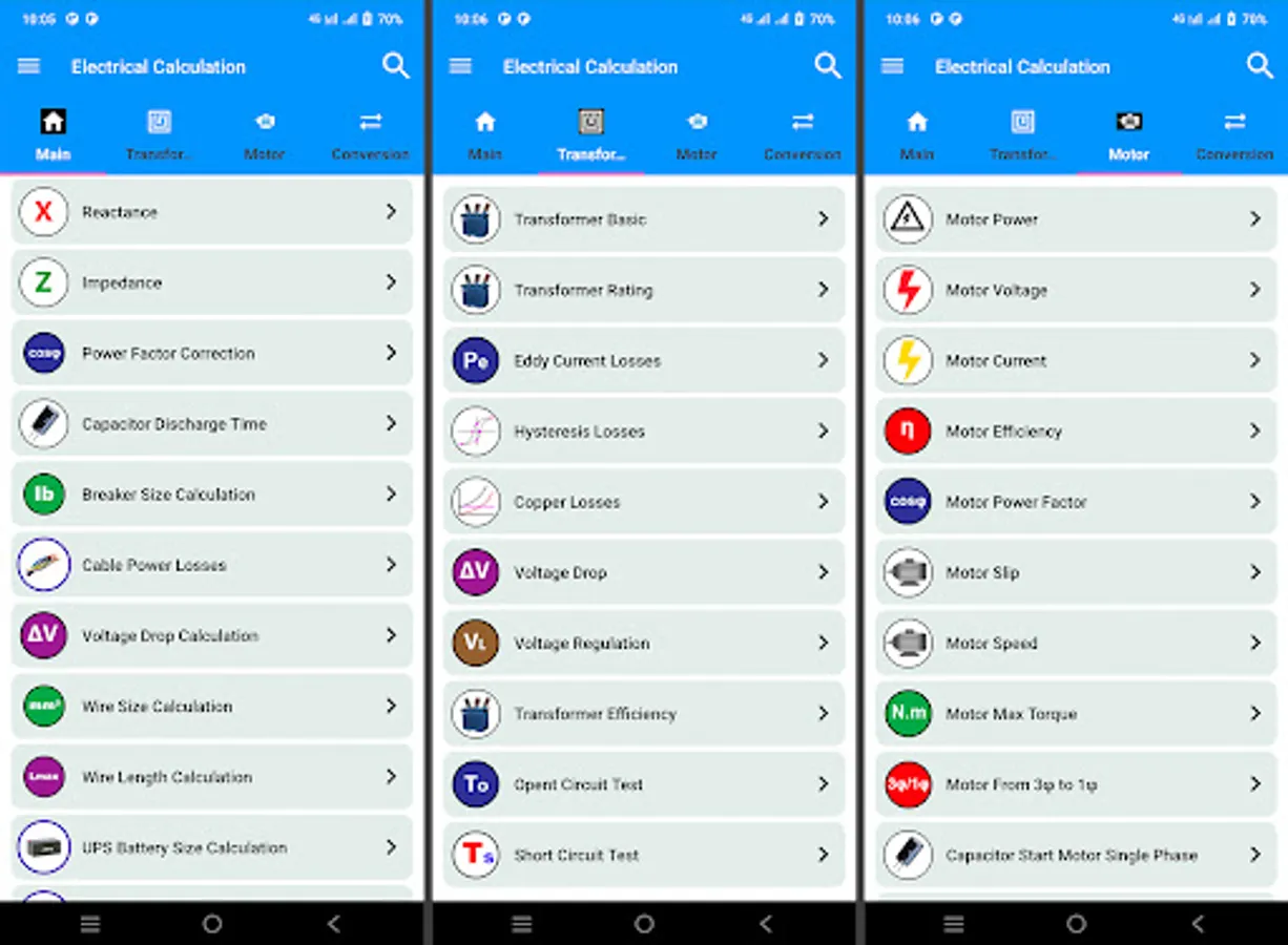 The electrical calculation app is a very useful calculation app used to help electrical engineers make their lives easier. The electrical calculation app contains all types of information that electrical engineers require, like electrical formulas for voltage, current, and efficiency, all available in the electrical calculation app.