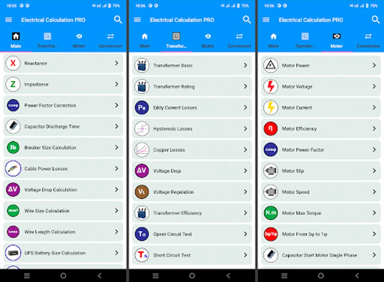 The Electrical Calculation PRO app is very useful and best app for electrical engineers and electricians. It has many calculations that can help you in your work. This app are used by Electrical engineers and electricians, working on daily basis in the electrical field.