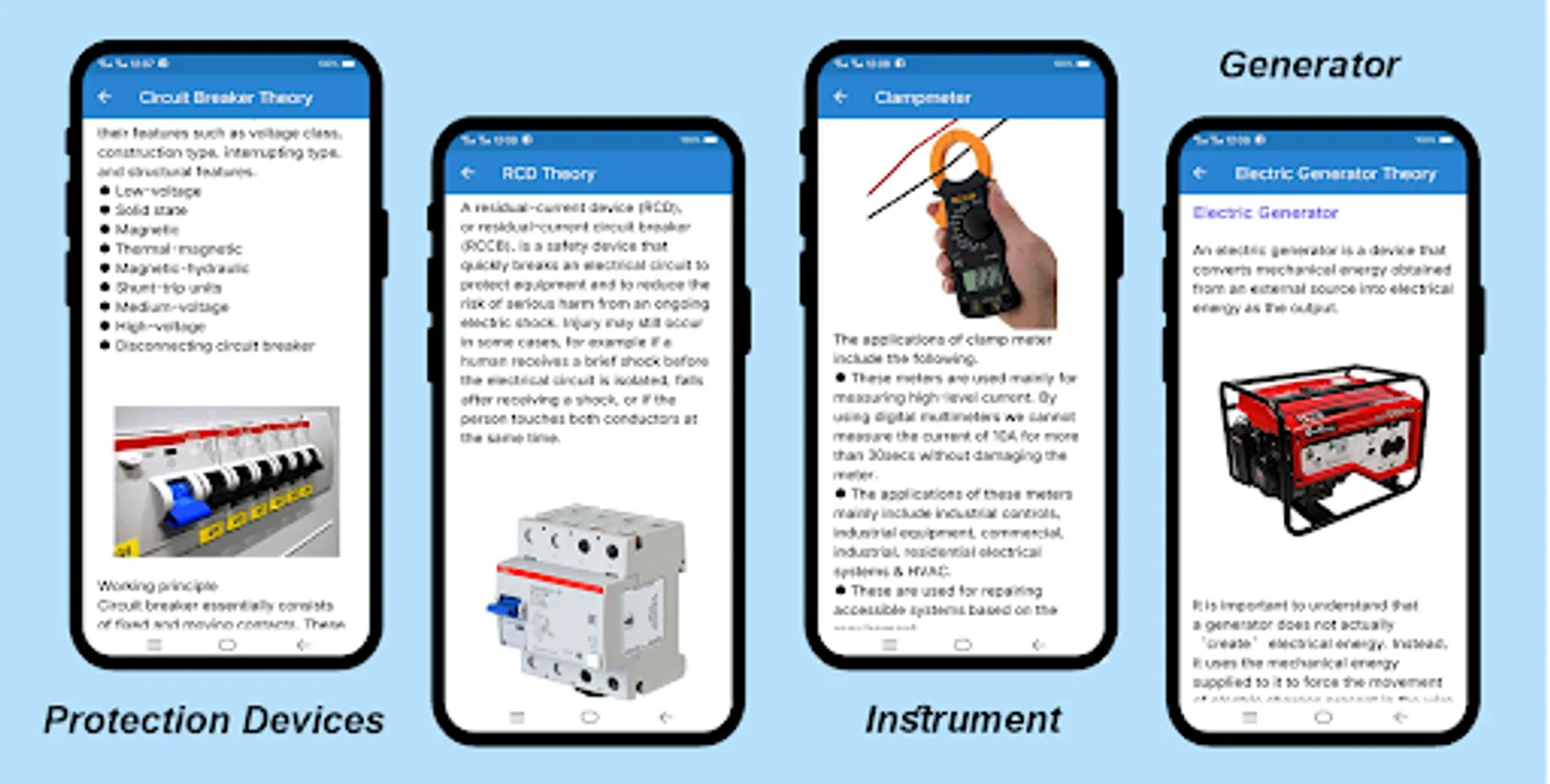 ✔ The electrical theory part contains basic theory of current, resistance, voltage, power, circuit breaker, fuses voltmeter, clamp meter and many more written in brief and simple language. Read this electrician's guide and basic electrical engineering app to understand how electricity works in your home.