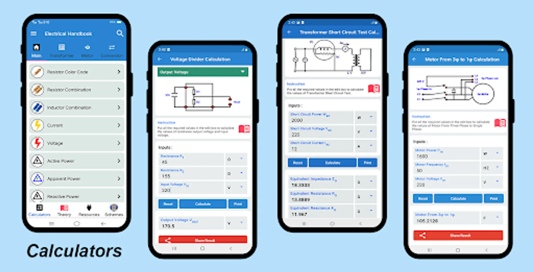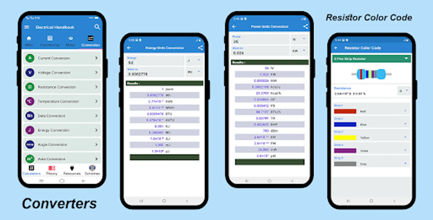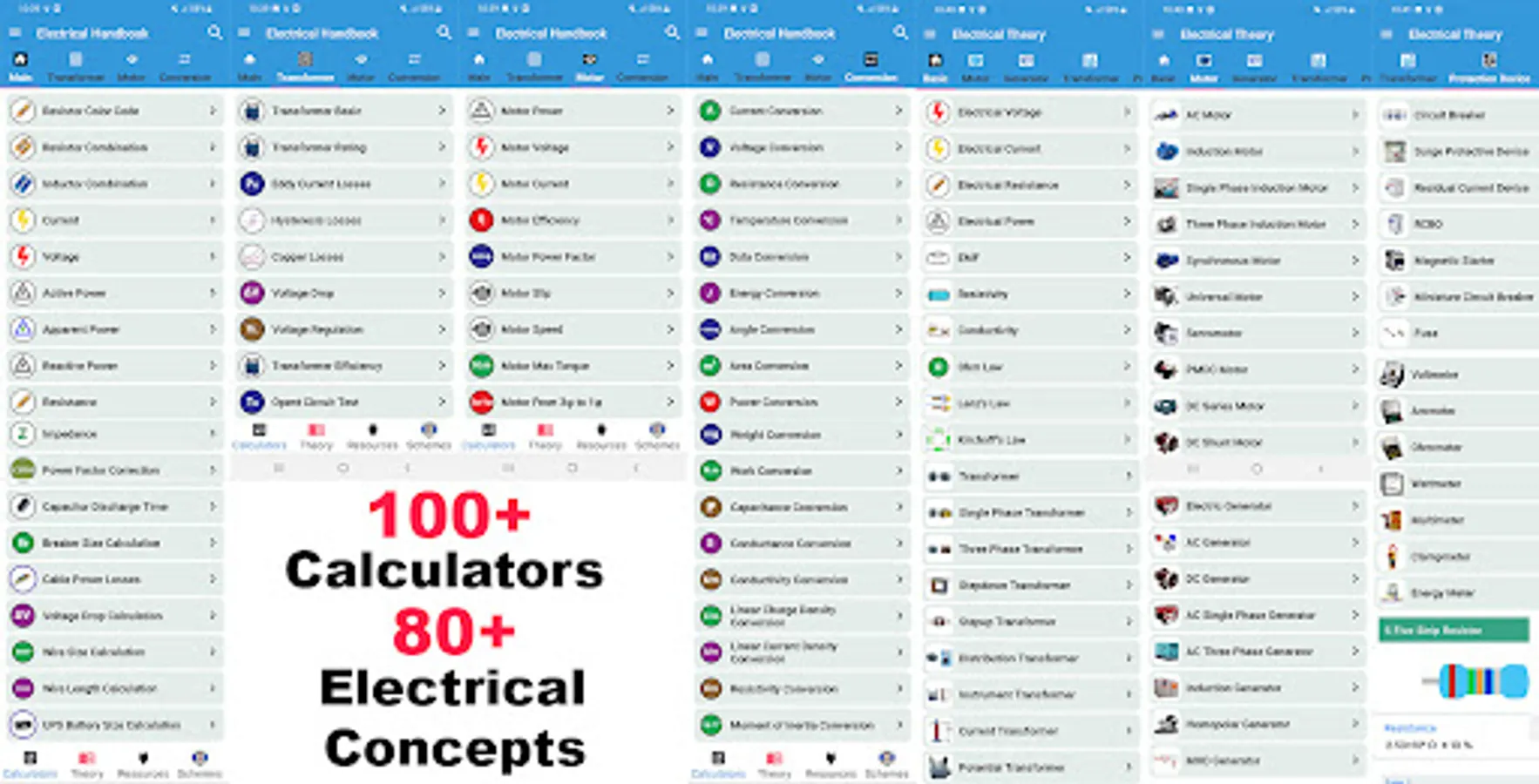 ✔ The electrical calculators part contain basic calculators with simple user interface included, ohm's law calculator, power calculator, resistor color code, resistor in series and parallel calculator, capacitor and capacitance calculator, electrical motor power calculator, electricians calculator, electrical wiring calculator, electrical wire load calculator, electrical watts calculator, voltage calculator, current calculator, transformer basic calculators, electrical cable size calculator, electrical circuit's calculator, electrical formulas and so on...