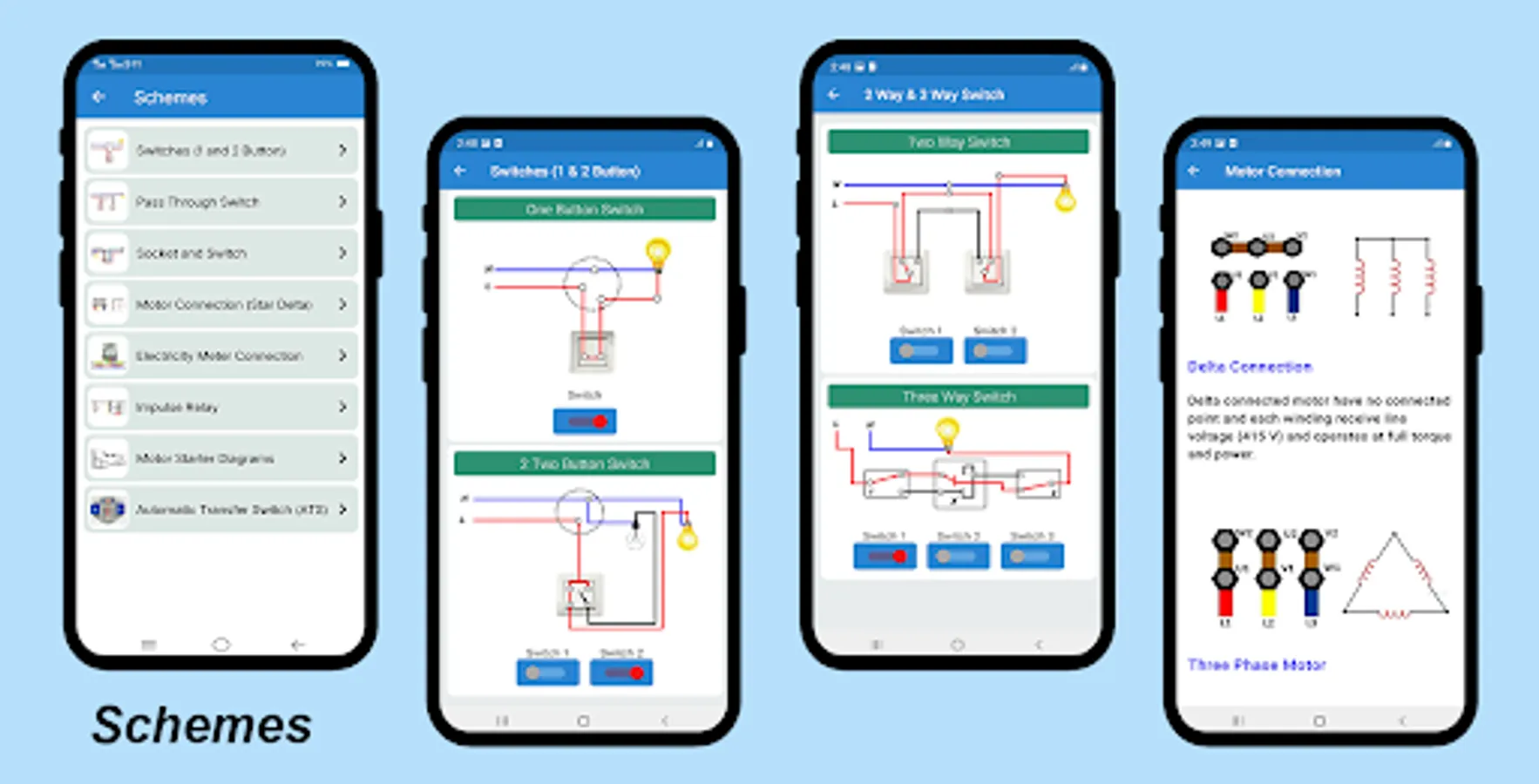 ✔ The diagrams part contains connection diagrams of switches, sockets, motors, relay's and many more...All the diagrams are simple, neat and clean.