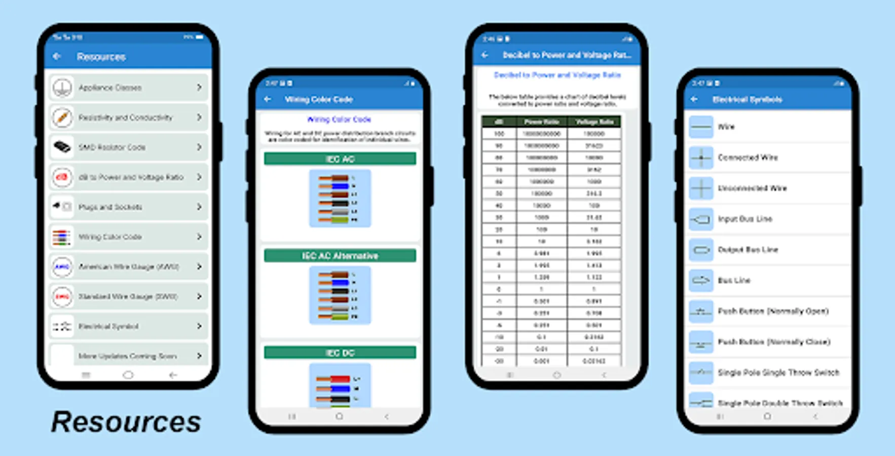 ✔ The electrical engineering app also contains resources which include resistivity and conductivity table, SMD resistor table, wiring color code used in different regions and countries and many more....