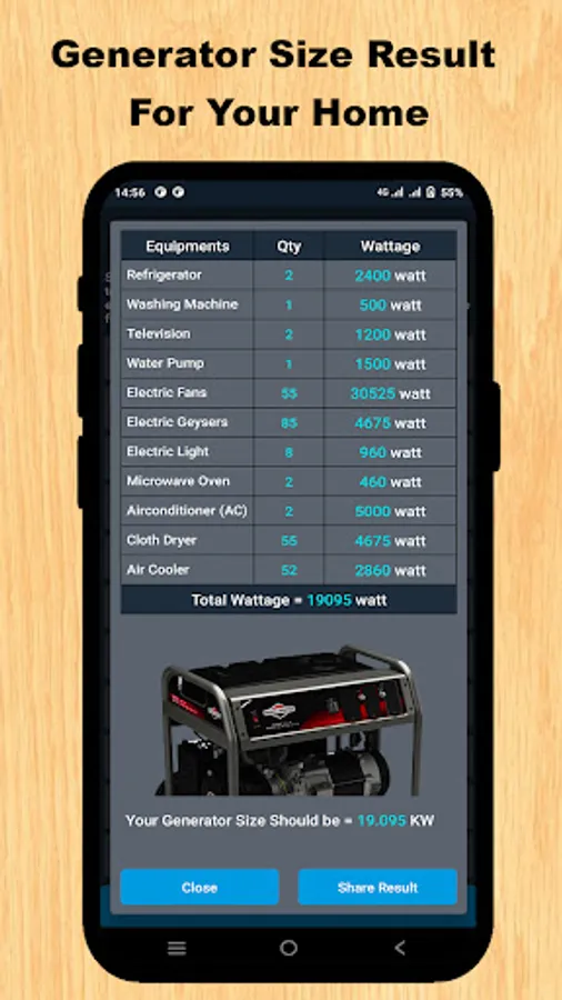 The application also contain the generator design for your home, for a residential building or for any work place. Select the appliances from the given list, put the numbers and wattage of each appliance to calculate the generator size for home or for any work place.