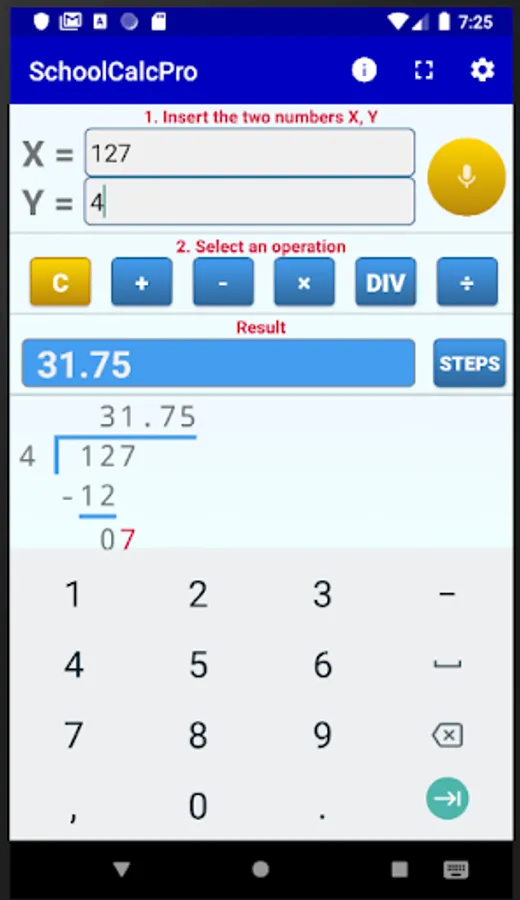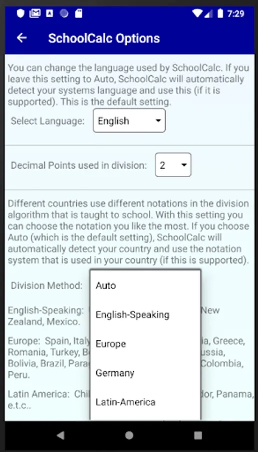 You can choose to use a variety of algorithms for long division (US and UK method, European method, Latin America method e.t.c.) or you can let the calculator choose the method that is used in your country. You can also change the language used by the long division calculator.