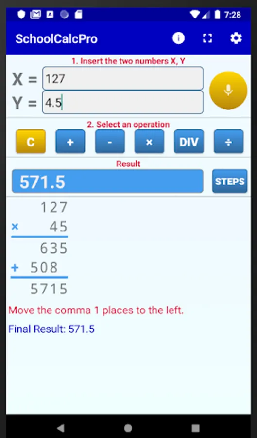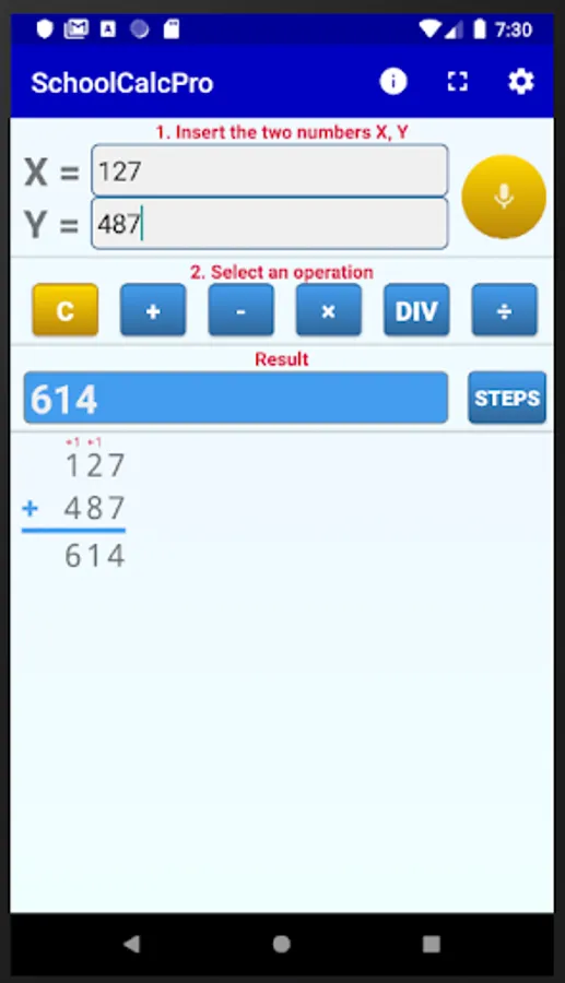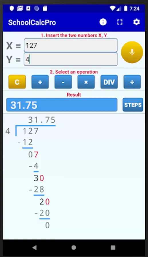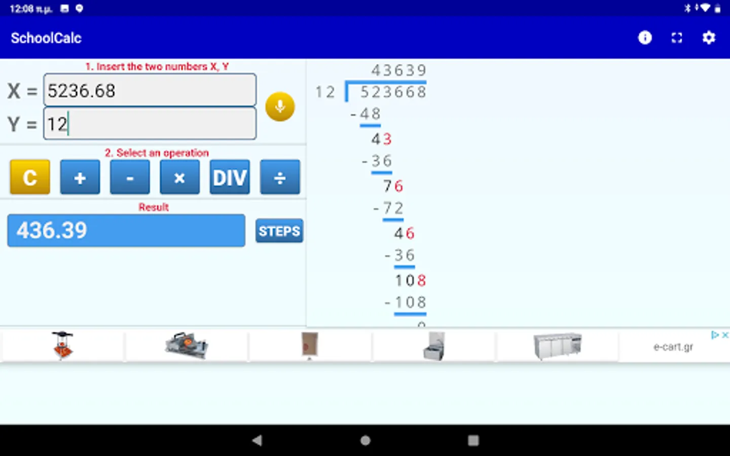 The long division calculator shows all the details of the operations (including carries, e.t.c.) step by step.