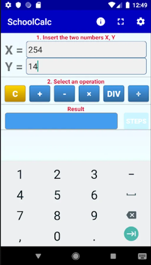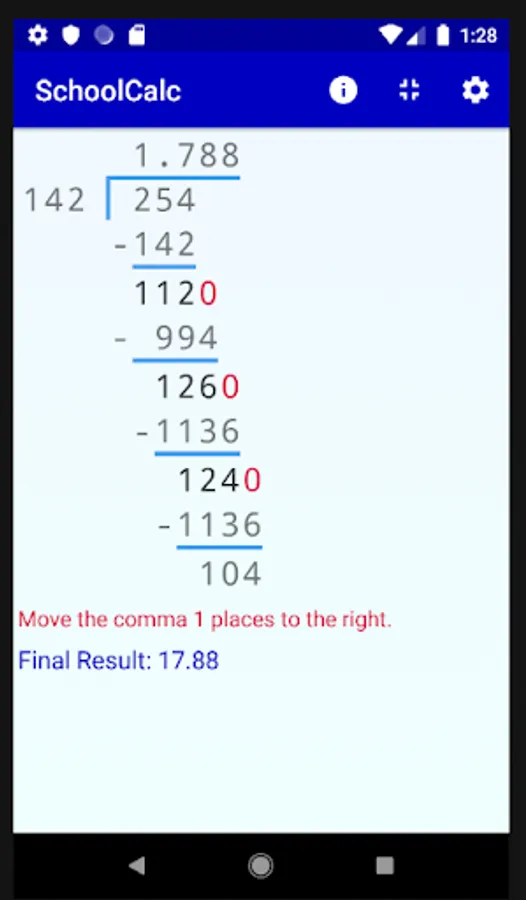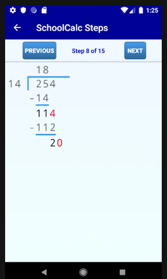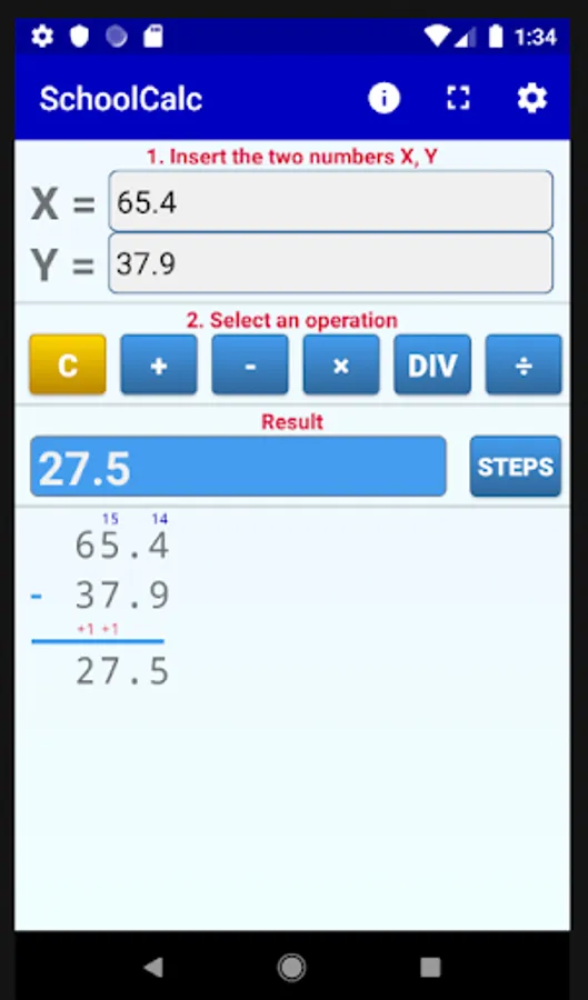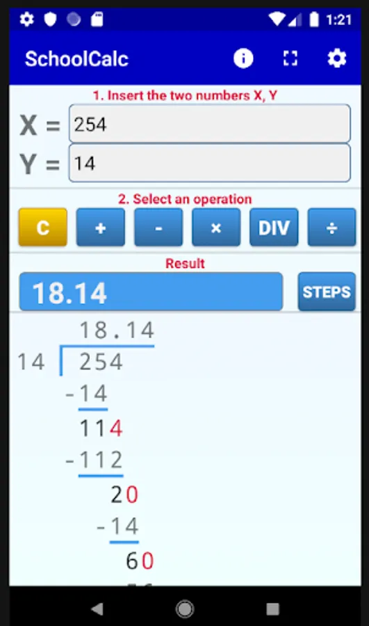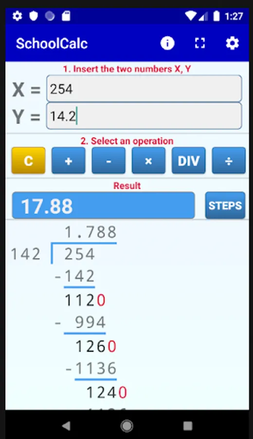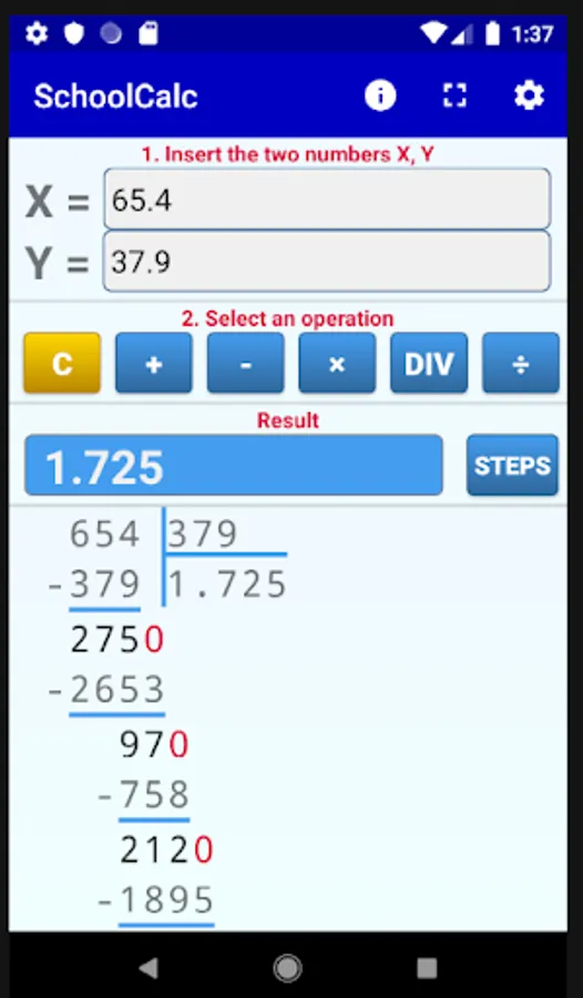The app implements all basic operations between a pair of numbers. Besides long division you can use the app for multiplication, addition and subtraction. You can see all the details of the operations (including carries, e.t.c.) step by step.