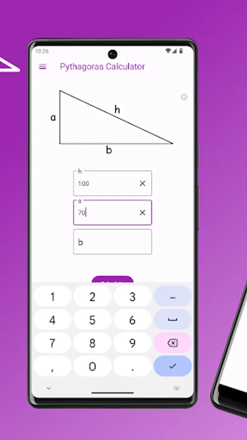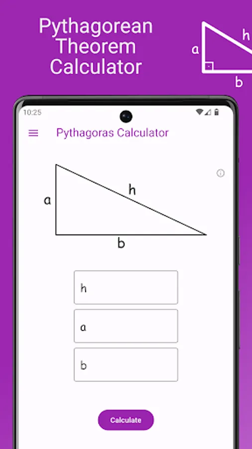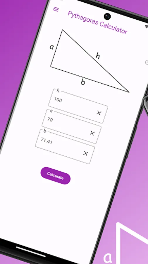 Fill in the two text fields with the corresponding values of the sides you already know and get the result of the formula to find out the unknown side.