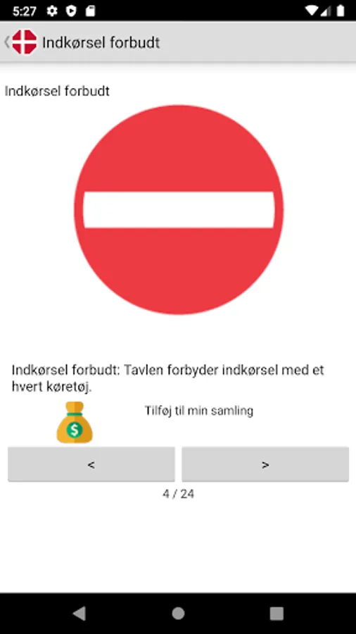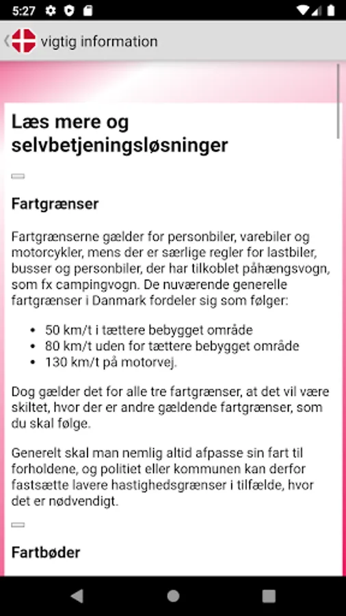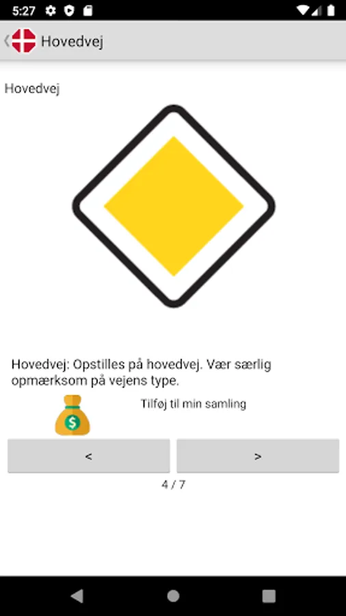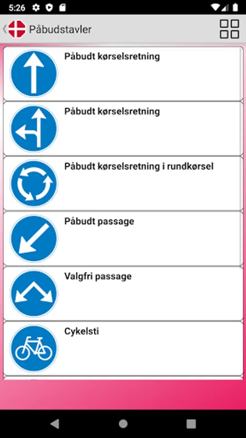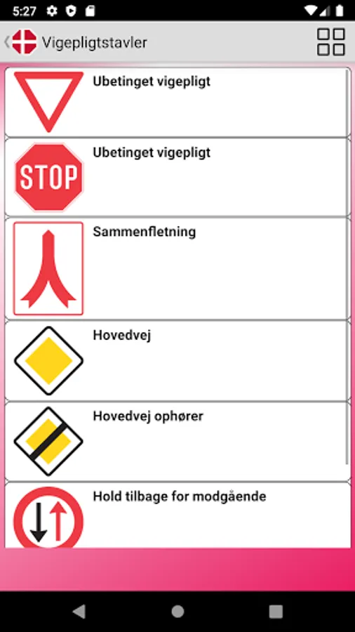 Danish main traffic and road signs with picture and main description.