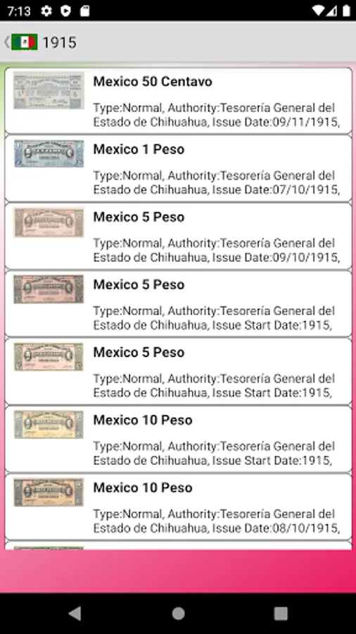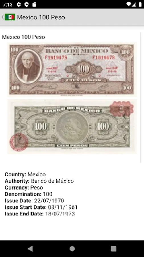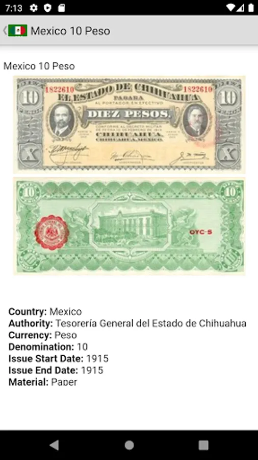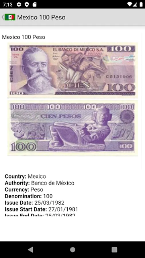 Each banknote entry comes with information about issue start day, issue end day, denomination and material it made from.