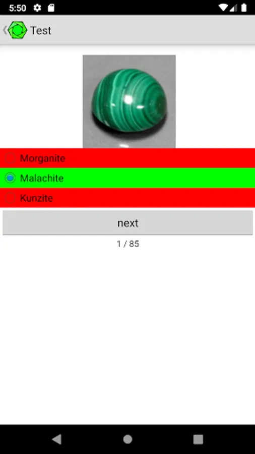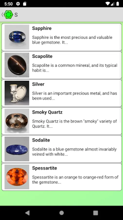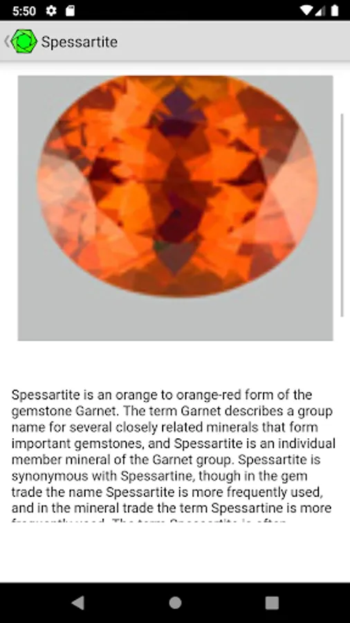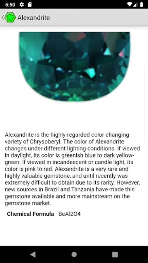 Each gemstone entry contains pictures, general information, geological details, chemical formula and different properties (colour, hardness, cristal system, transparency, luster, mineral class). You can also use the favourite button to create your collection and quickly access them.
