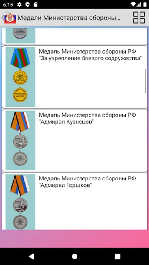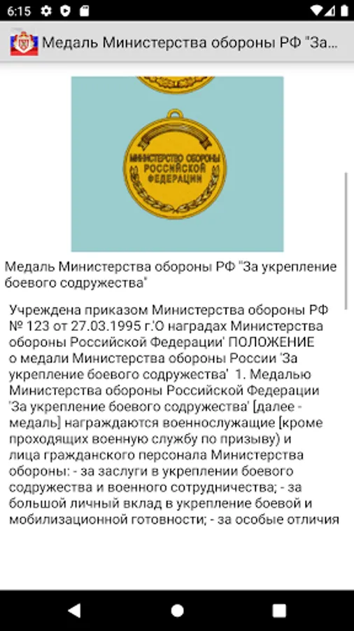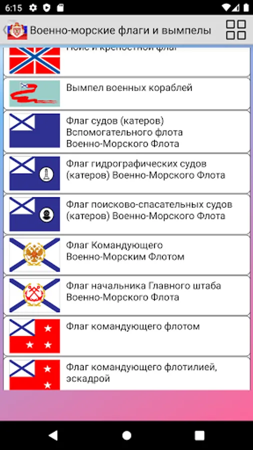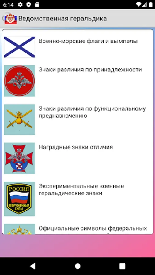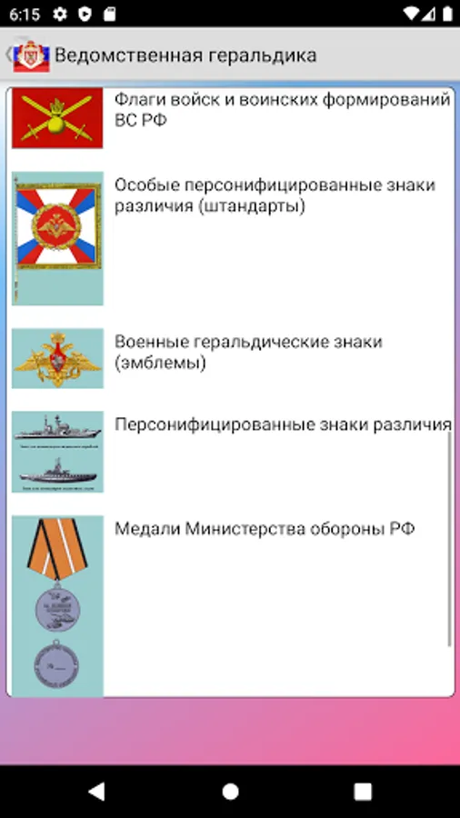 The application contains a catalog of official symbols and distinctive signs of the departments of the Russian Federation.