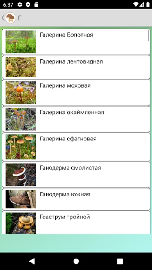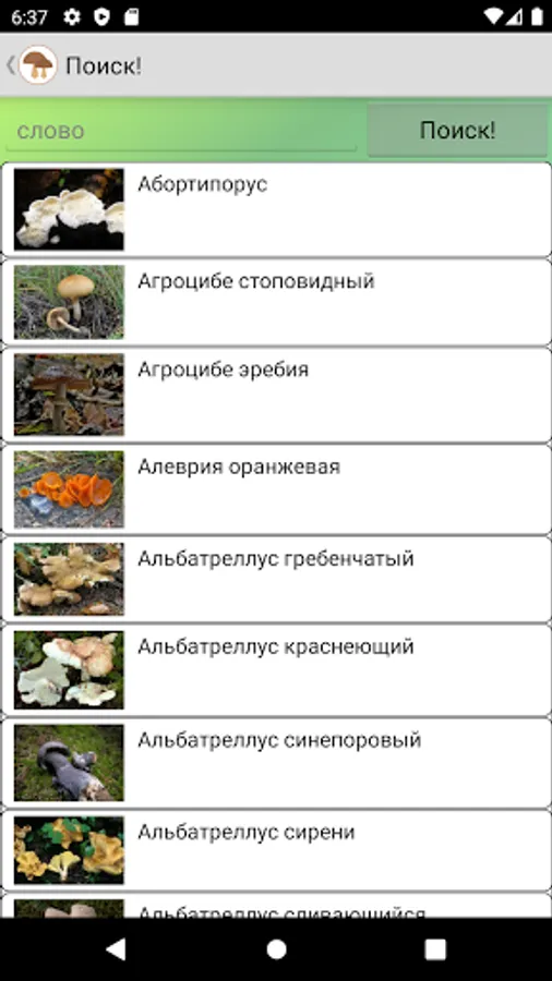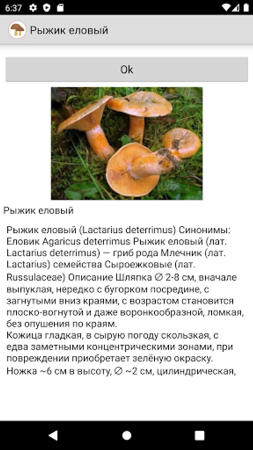 In the application "Mushroom picker" you will find a list of all edible and inedible mushrooms with photos and their detailed descriptions.