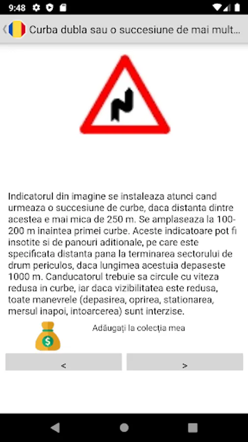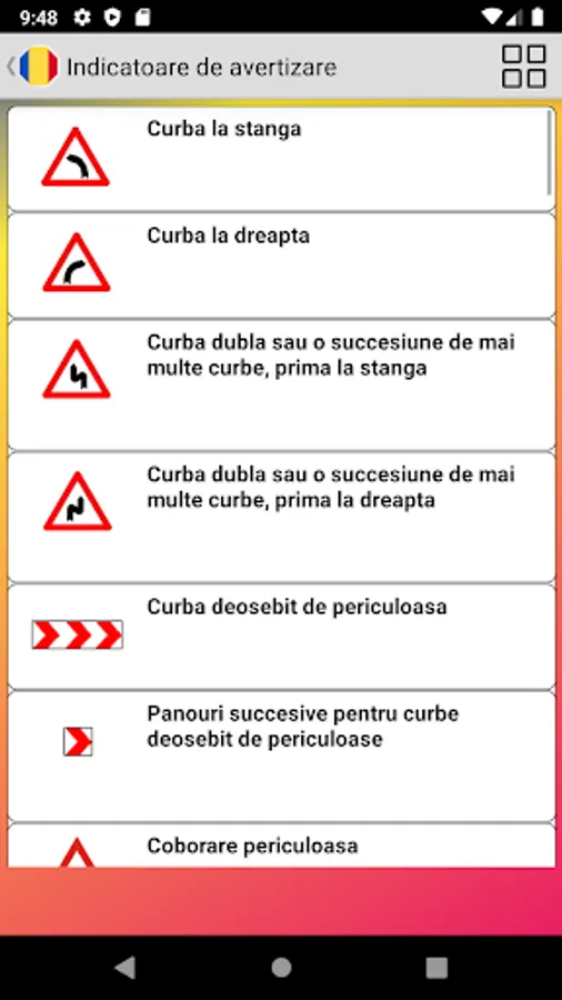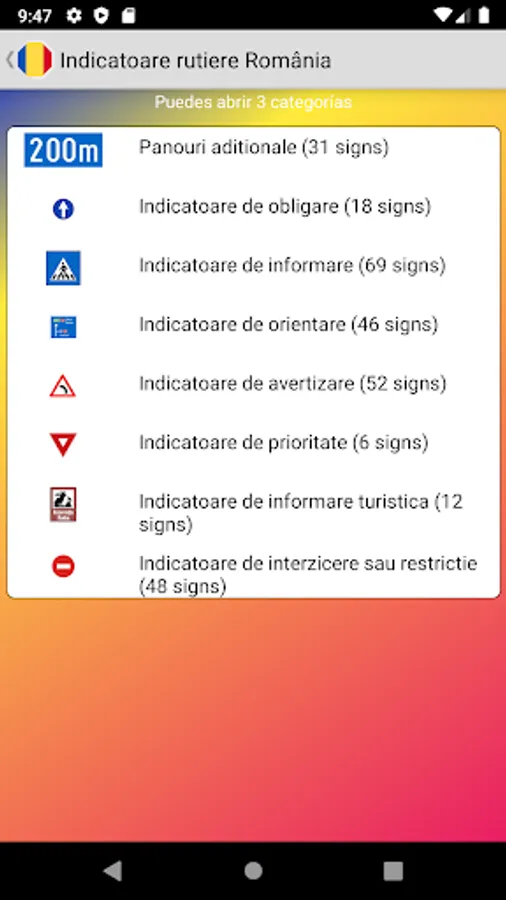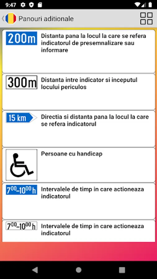 In this application, you will get free Romanian road signs with images and a description, the ability to test your knowledge in the test.