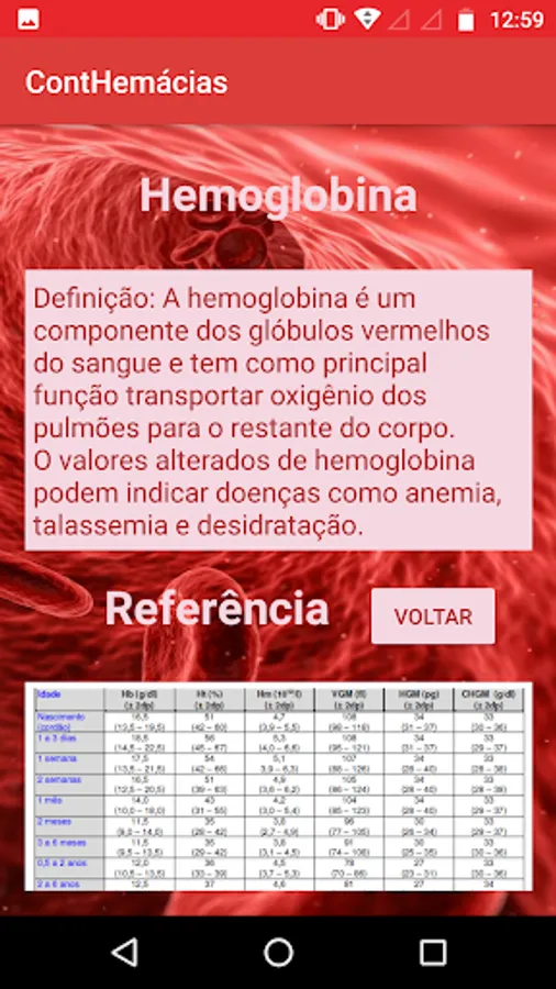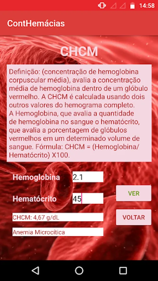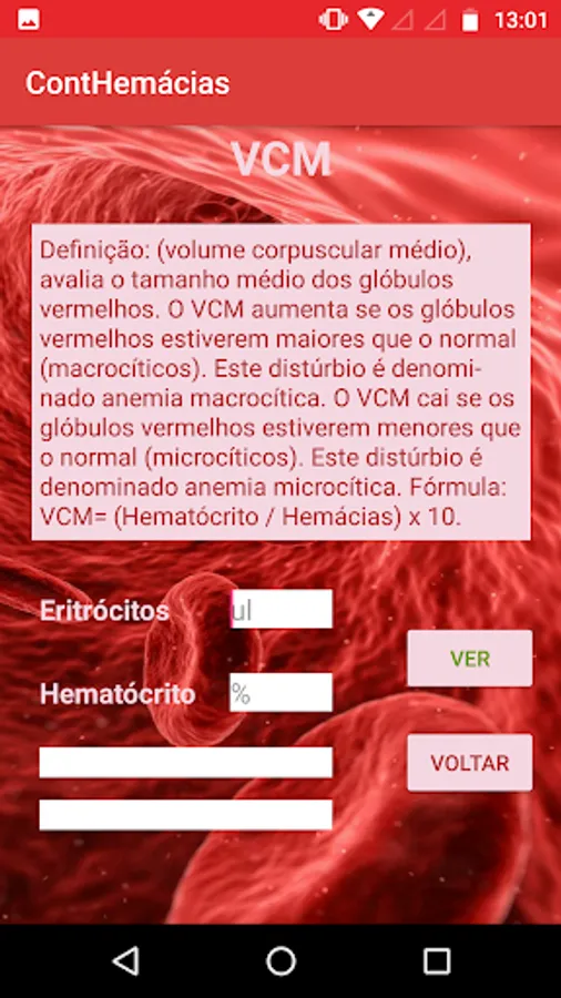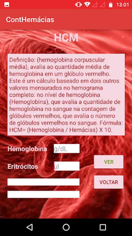 It is a very useful and practical application for interns, assistants and laboratory technicians, so they can quickly consult the definitions and calculations of the blood count: RBC count, Hematocrit, Hemoglobin, VCM, HCM, CHCM and References.