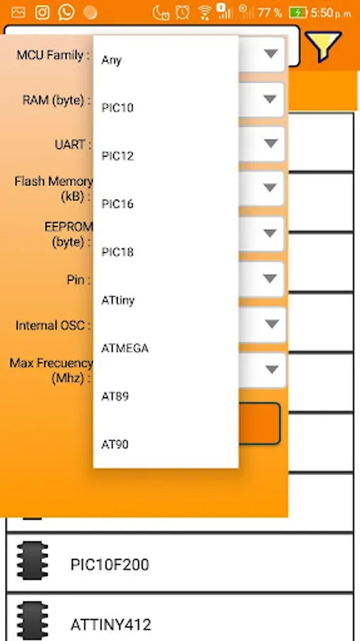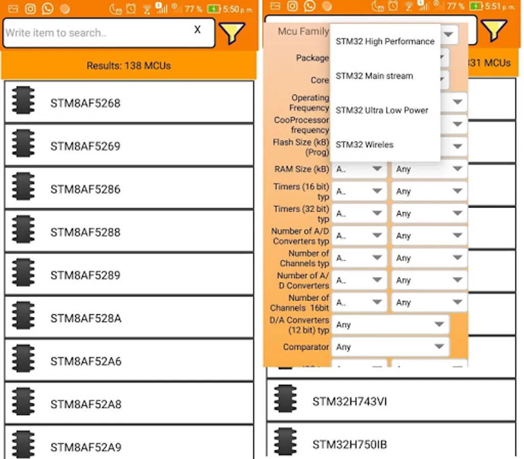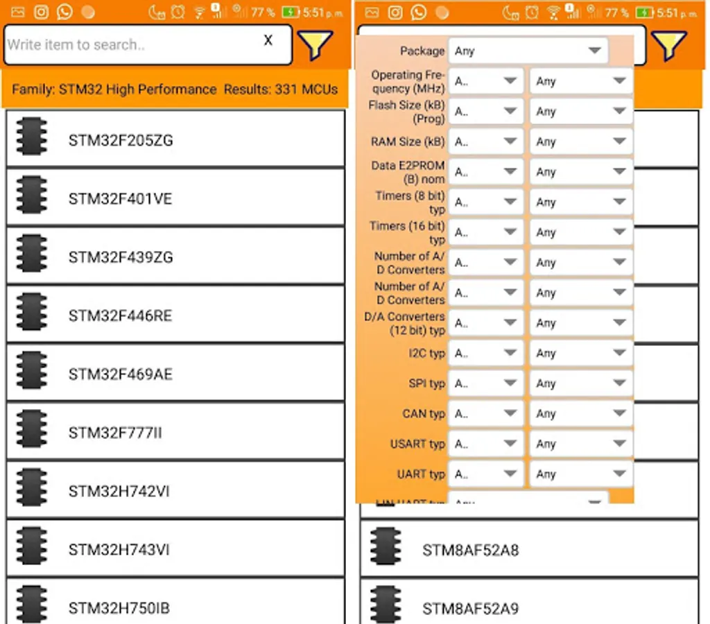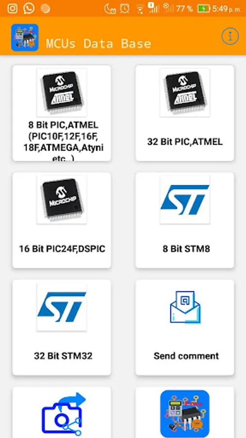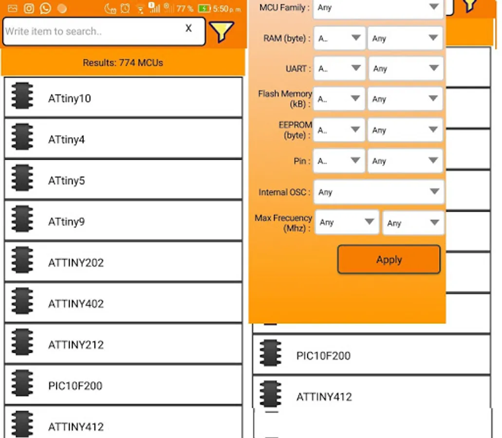 Excelente Base de datos de microcontroladores PIC, AVR, STM en una sola app