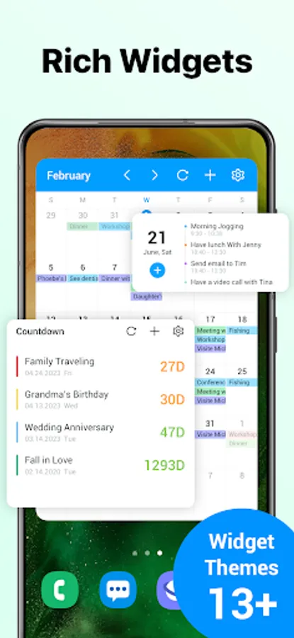 Customize your calendar widget with different sizes and themes. It supports month calendar widget, day calendar widget, list calendar widget etc.