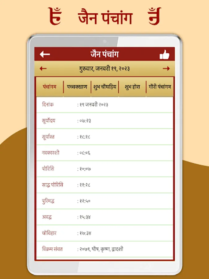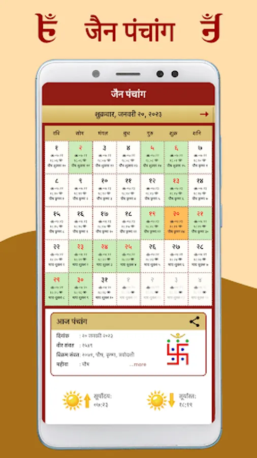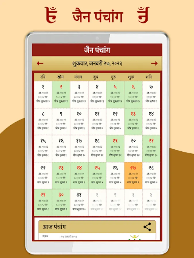 Discover the comprehensive world of Jainism with the Jain Panchang app. Seamlessly navigate through an easy-to-use interface and unlock a treasure trove of valuable information about Jain traditions, festivals, and panchang timings. This jain calendar provides you with all the tools you need to explore and share the richness of Jain culture with your friends and well-wishers.