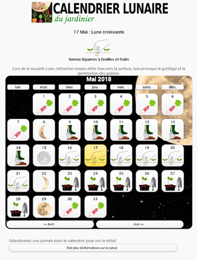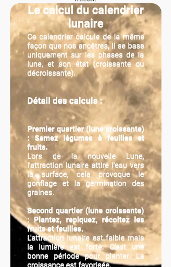 Unlike other calendars that you can find, it does not take into account the up or down position of the moon, in fact, this parameter has no proven effect, and is not visible to the eye naked.