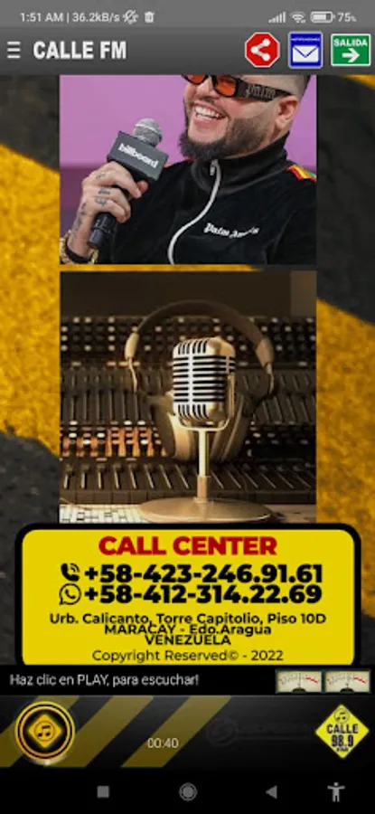 With this app you have the possibility to listen to the programming of Calle FM, with just one click, 24/7, 365 days a year.
