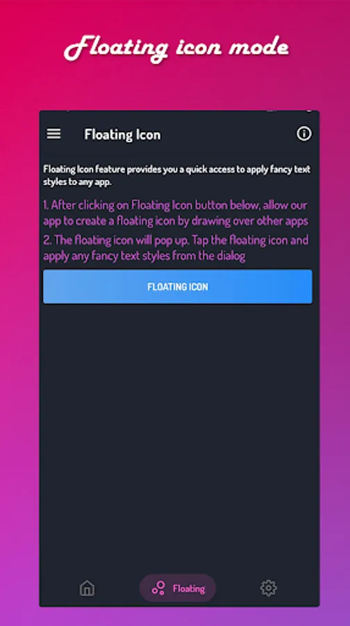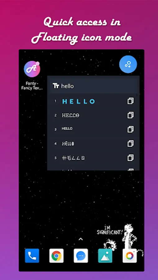 What else? Our app also comes with a floating icon mode, which when enabled provides you with a floating icon that allows you to quickly add styles to your text, for example, while using a messaging app. You can share all of the fancy text symbols and stylish texts created from our app using cool fonts and symbols with your friends and family via all of the major social networks and other apps. I hope you like our stylish text app. π₯°