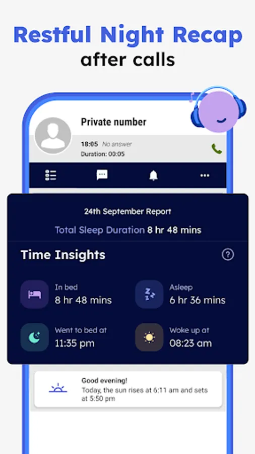 - Access your essential sleep data metrics seamlessly right on your after-call screen! Stay informed about your sleep quality, duration, and trends in one glance after a call.