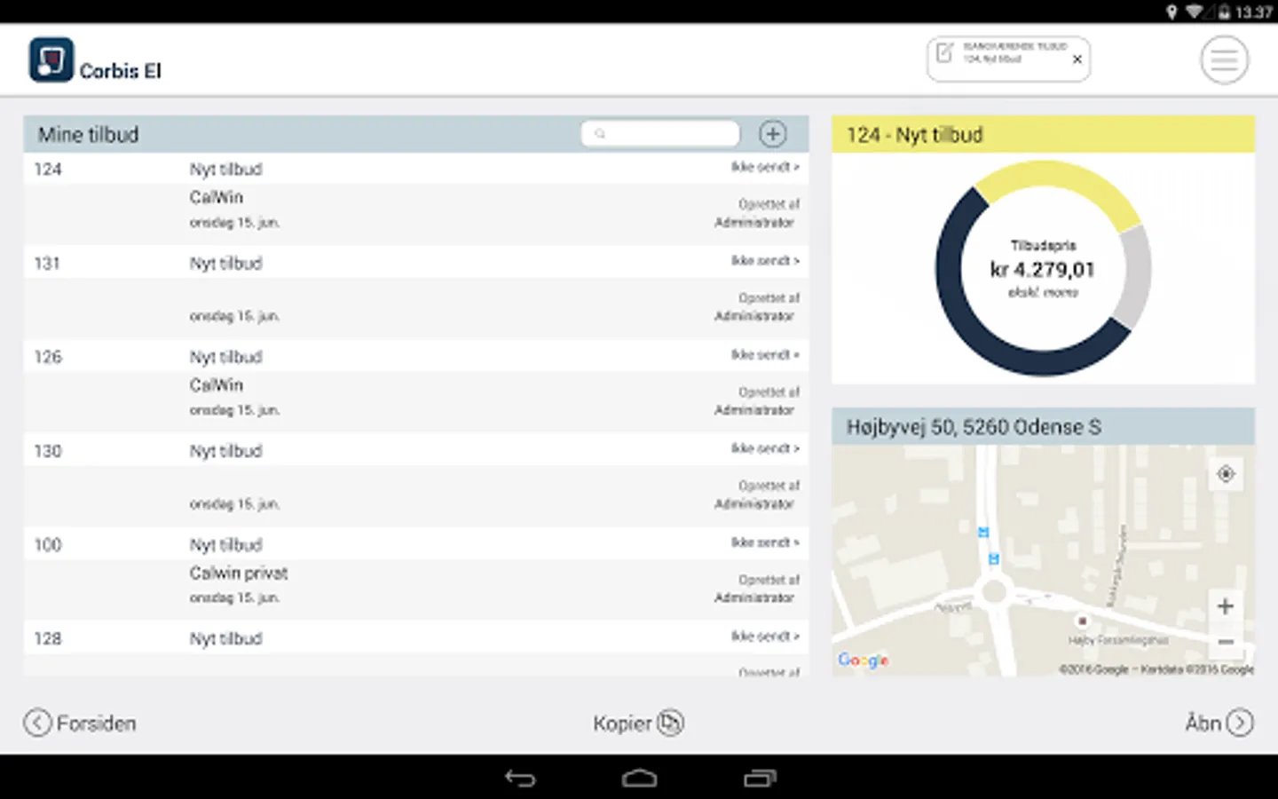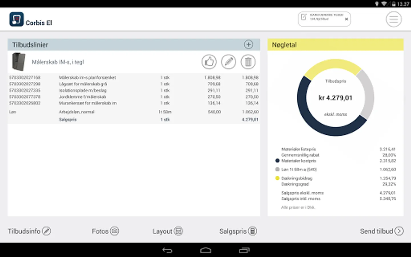 Corbis El is an innovative quote system which you can prepared a full Deals EL task on your tablet at the customer. The offer includes job descriptions, pictures of products, photos and a total price incl. mounting. The offer sent directly via the tablet to the customer in the same working time - You save time and you get happy customers who do not have to wait for the offer from you. "