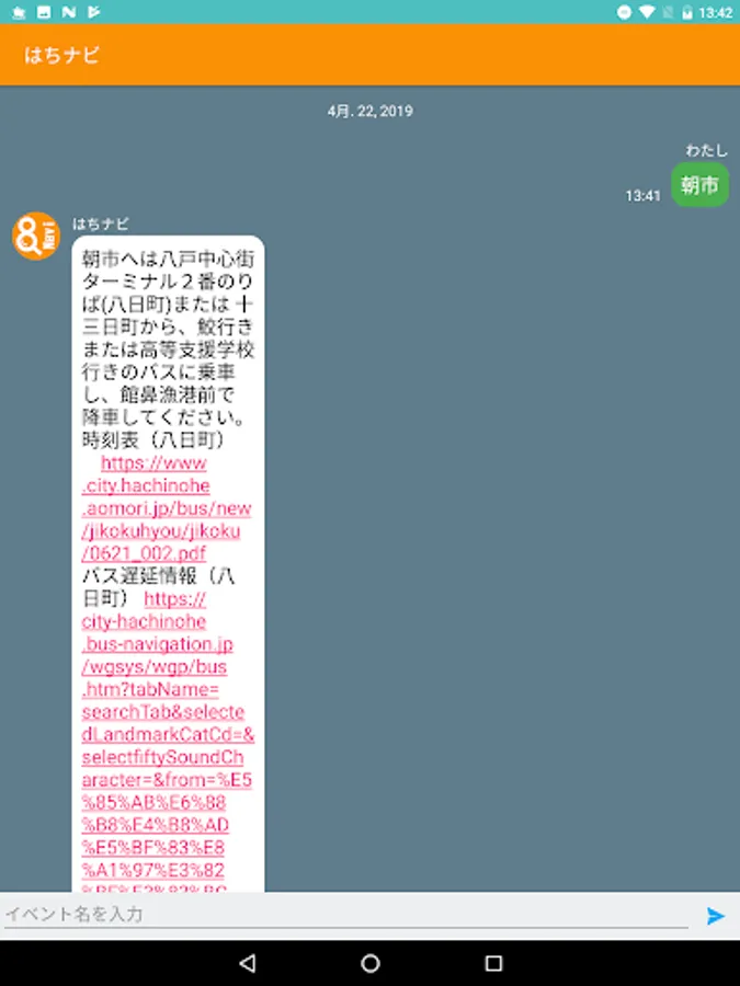 イベント名を入力すると中心街からそのイベントへ行くバスの時刻表とバス遅延情報のURLが返答されます