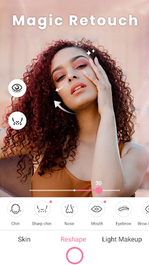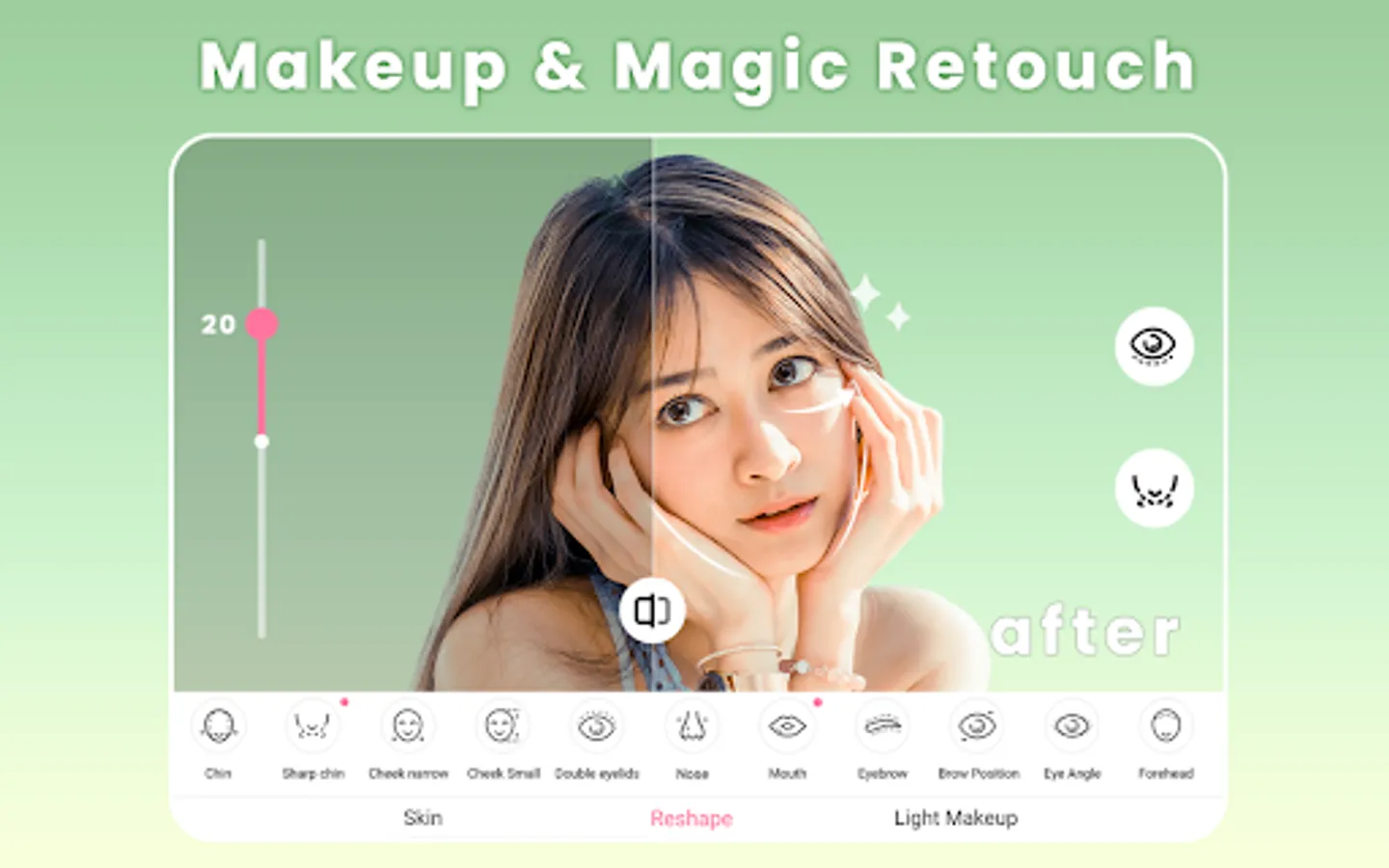 • Retouch Face: face shaper, face slimming, reshape cheekbones, chin, jaw, forehead