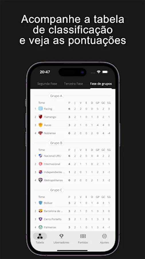 Follow the exciting Libertadores up close through our dedicated app. Always be informed about match schedules, score results, team standings and all exciting games.