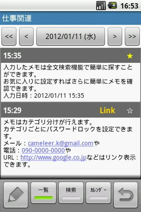 簡単な操作で使える機能的なメモ帳です。メモをカテゴリ分けが出来る為、お買い物メモ、日記、ビジネスツール、営業&得意先メモなど、様々な用途に応用できるように考慮しています。