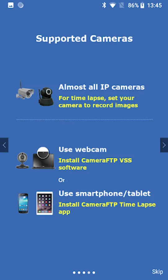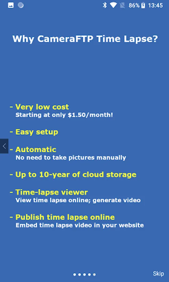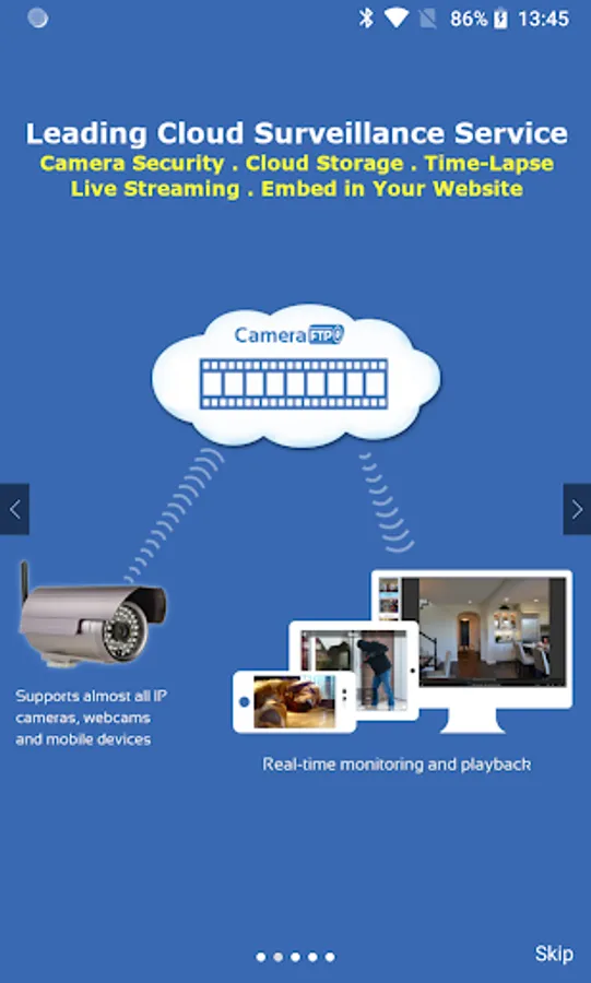 CameraFTP Time Lapse App can automatically take pictures and upload them to CameraFTP cloud storage. You can generate time-lapse video online, or download images and create high-quality time-lapse video offline. You can publish or share the time-lapse camera, or embed it in your own web page.
