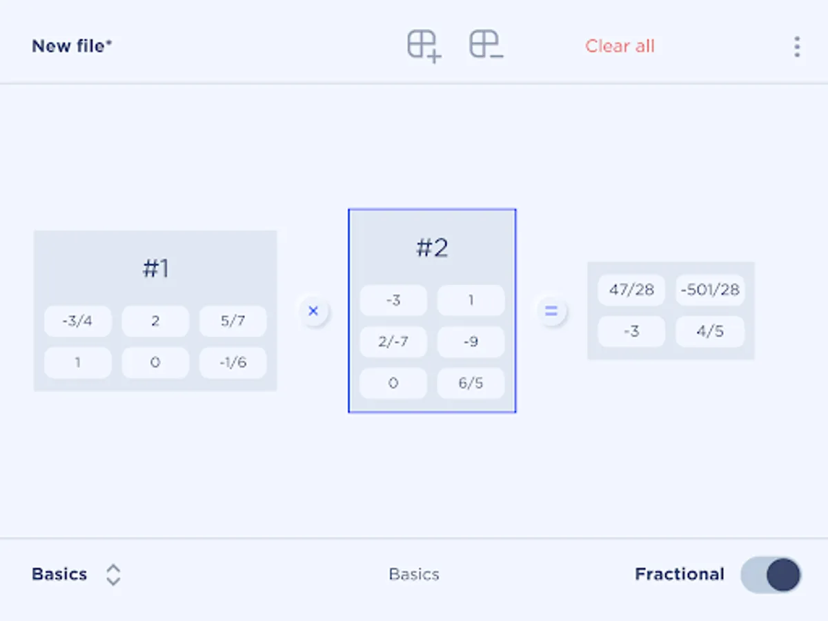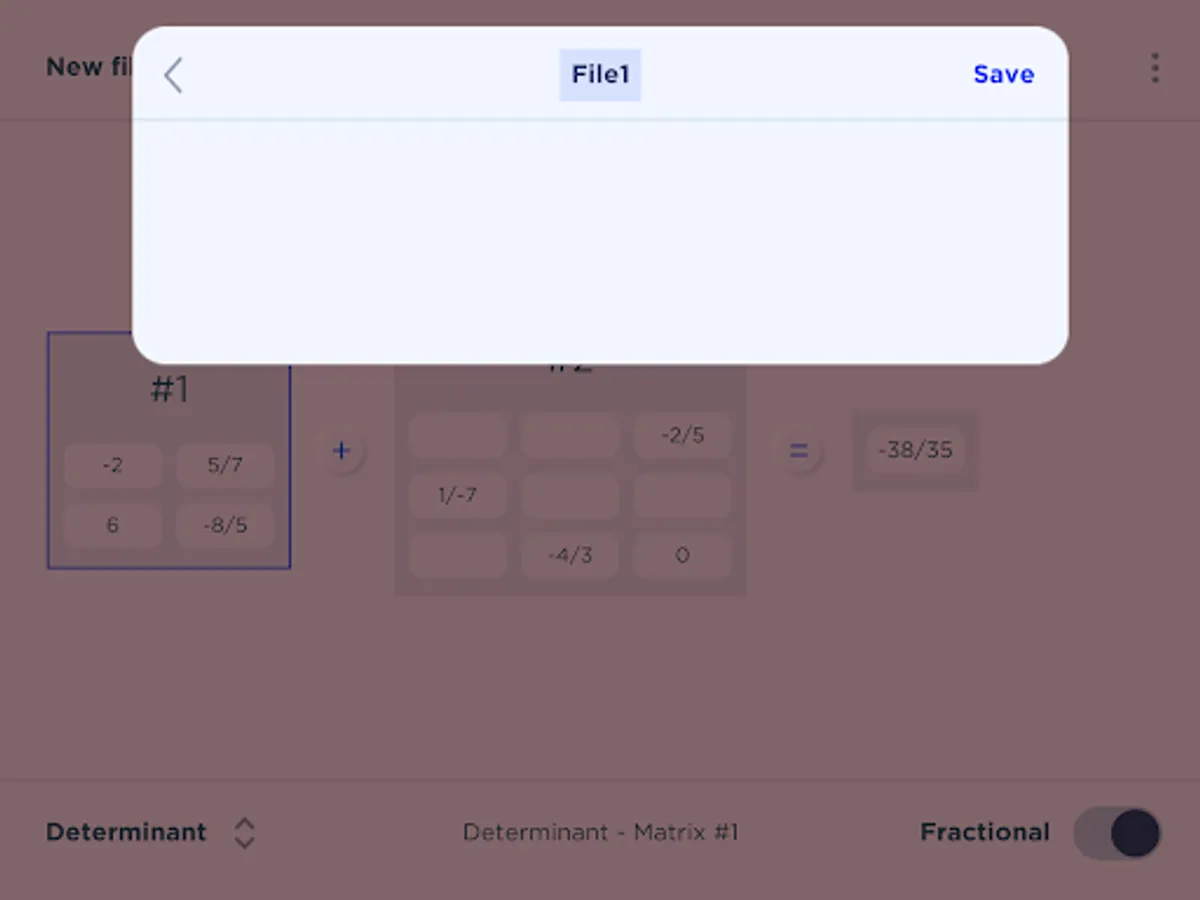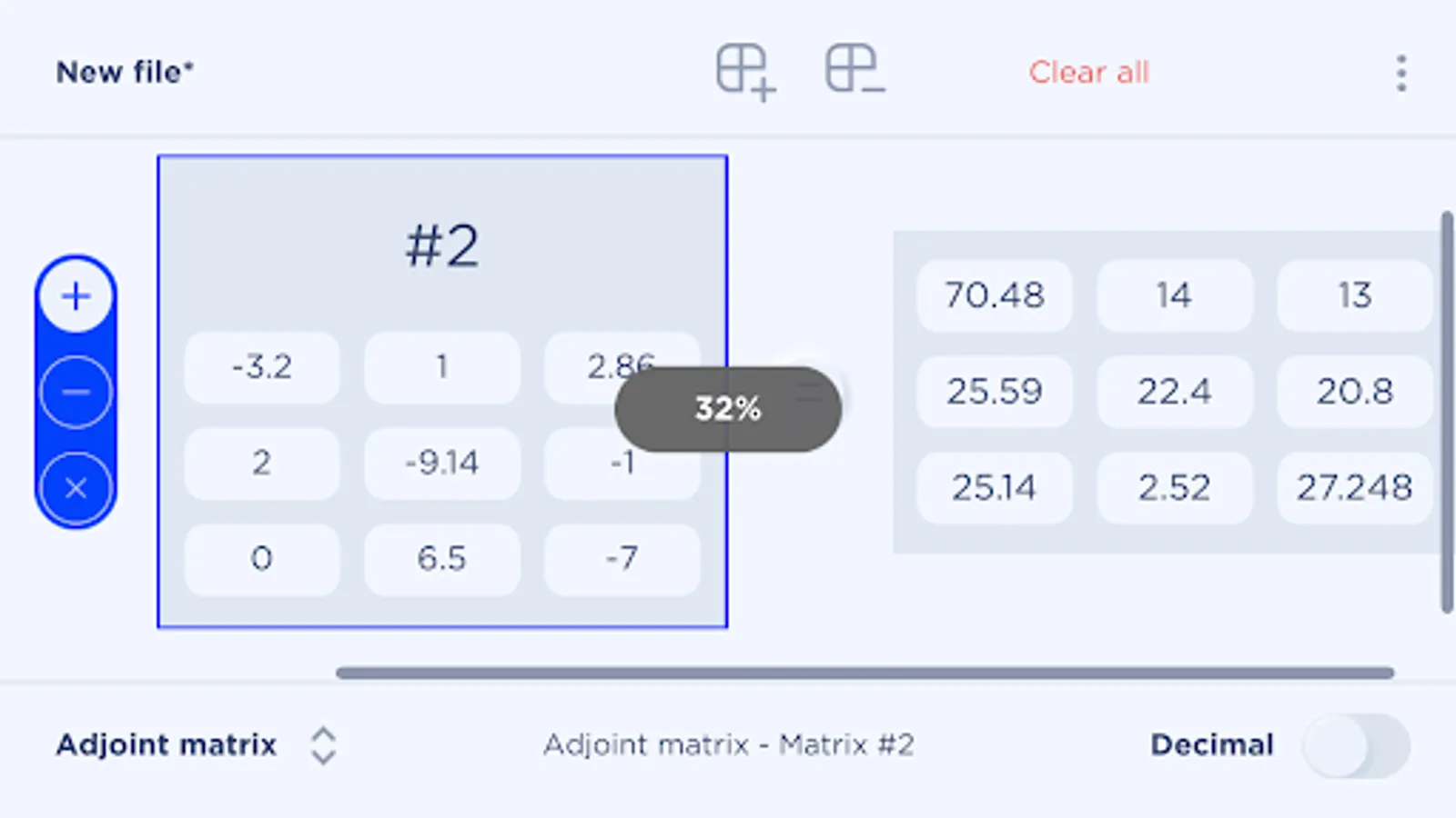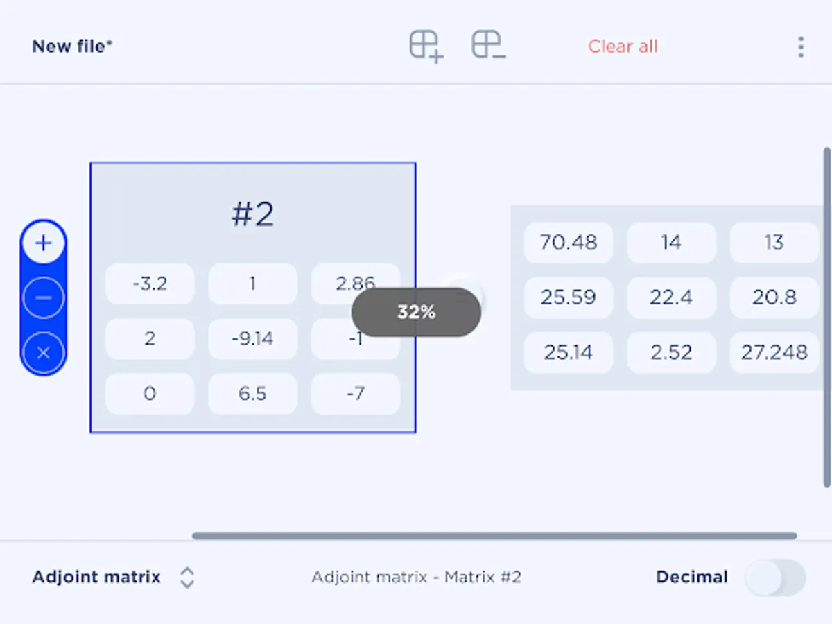 A spectacular application in which you can do operations with matrices, such as Addition, Subtraction and Multiplication. In addition you can also find the Transposed matrix, Adjoint matrix, Inverse matrix, Determinant and Rank of a matrix. (MxN)