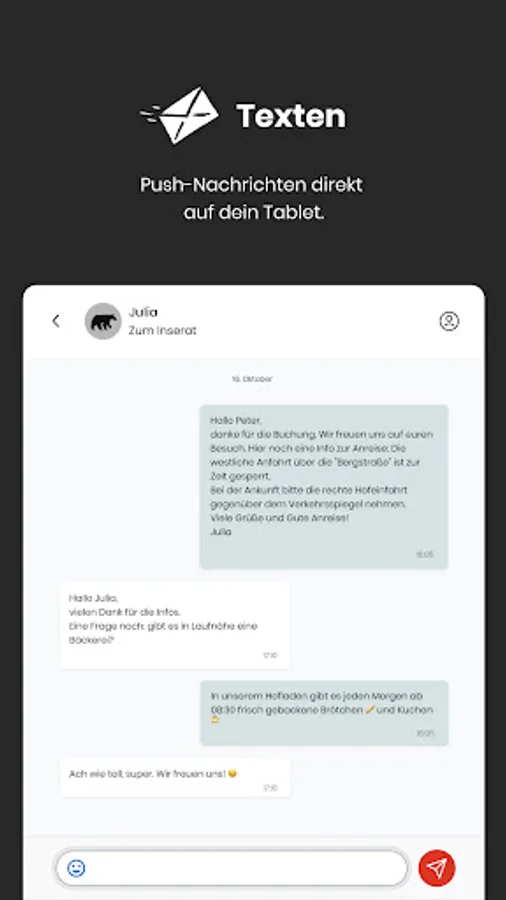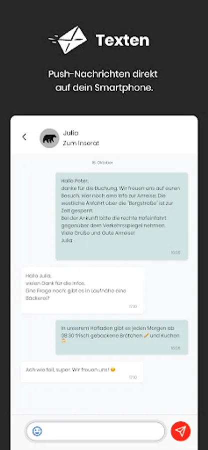 You can ask questions about places or accommodation easily and directly to the hosts via the integrated chat
