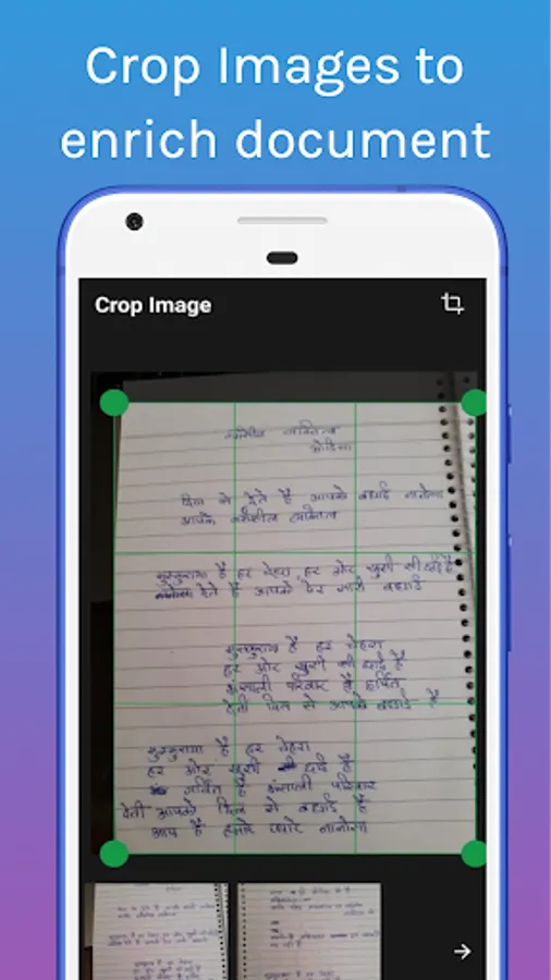 This simple and easy to use document scanner app is a quick phone canner app for your android phone. Using the app, you can scan documents, identity cards, etc. using your phone's camera. The app includes amazing features to not only scan your documents using the phone's camera, but also helps you crop to remove unwanted spaces in the photo.
