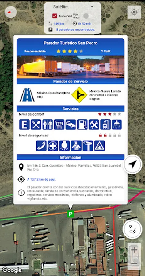Users will be able to trace origin-destination routes to identify the existence of paradores located within the perimeter of the generated route. In it, the operator will be able to consult the "comfort and security" services that the space has, among other information. In addition, you can rate and post comments about the place, so that this information is useful to other users.