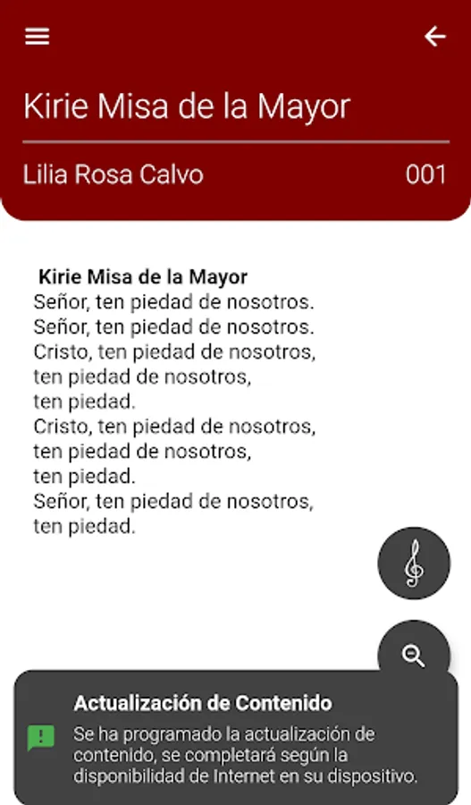Computer program carried out by the Conference of Bishops of Cuba and the RIIAL-CUBA with the aim of bringing to the digital version the book CUBA CANTA SU FE, designed for the Catholic church in Cuba, where all parishioners can run on the android mobile this application and consult all the songs that are collected in the book and the basic prayers of Christians. Its secondary objective is to reduce the volume of the android mobile during the stay inside the church and once the program closes the volume is restored.