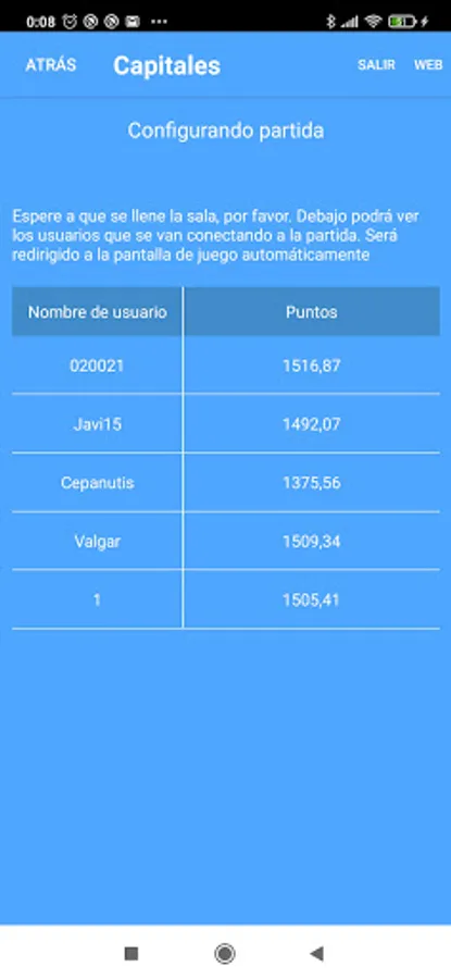The game has 8 players. The system will automatically configure the game by introducing players in the room until it reaches 8. A list will appear with the players who are joining the room, indicating their username and the points they have