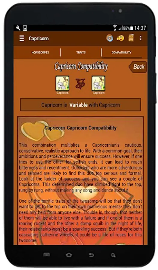 Capricorn compatibility helps you to understand your compatible zodiac signs. match signs to see which relationships are compatible -- and which are not compatible with you. Did you know that astrology can reveal a whole new level of understanding (compatibility) between people simply by looking at their star sign and that of their partner? Here you can discover your compatible partners and in-compatible friends/partners in various sun signs. This will help enable a pleasant and loving life with your partner.