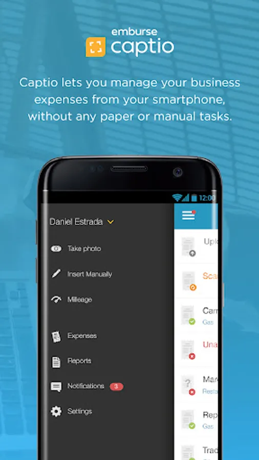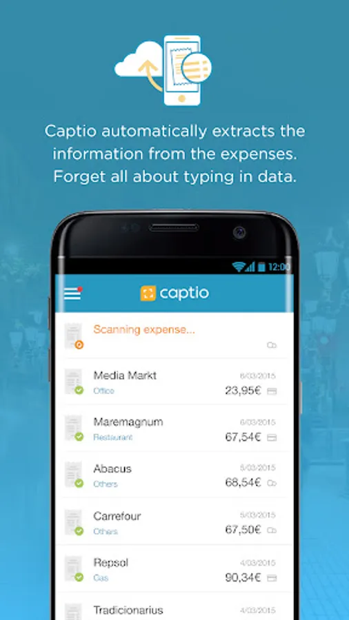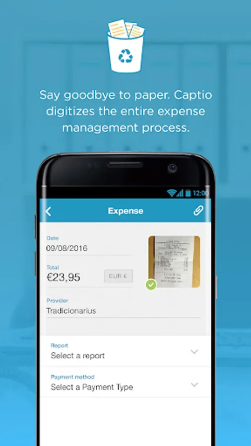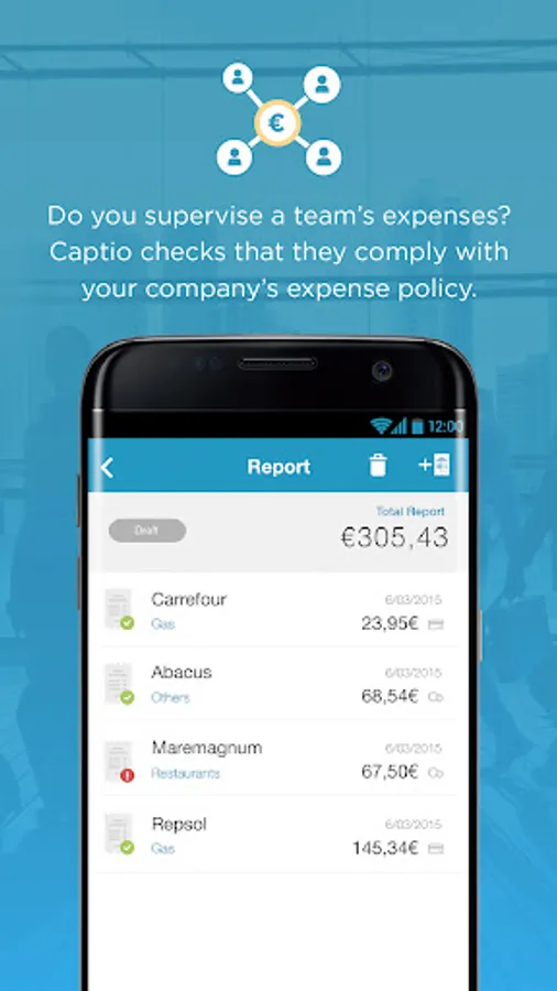 ✔ Supervising business expenses. Captio automatically verifies compliance with your company’s expense policies and notifies you of any breaches. The supervisors can revise the reports using their mobile handsets.
