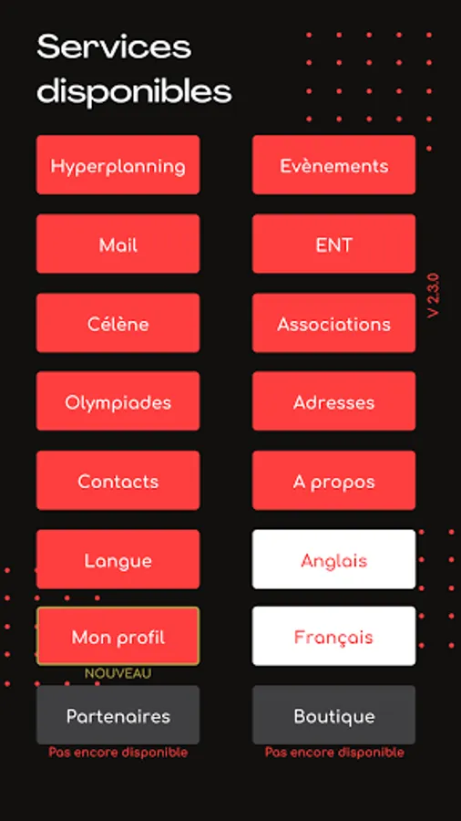 Available services: ENT, Mail, Hyperplanning, Célène, Associations, Olympics, Events, Contacts, Addresses