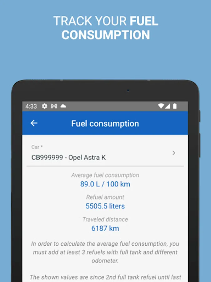Keep track of your car's spending for the last week, month or year. Control the refueling and be reminded of the mandatory fees - vignette, annual technical inspection, vehicle tax, annual insurance and more.