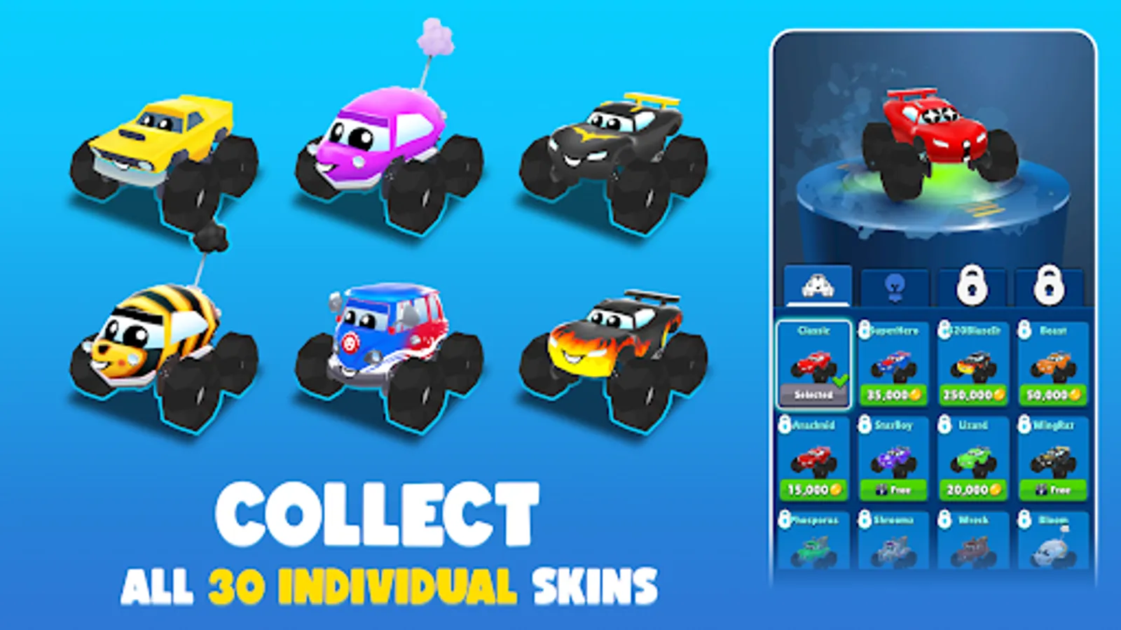 Customize your ride. Collect epic cartoon monster trucks and personalize them to reflect your style. Choose from exciting accessories, creating a one-of-a-kind racing machine.