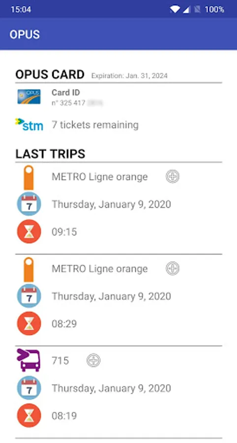 App displays pass, remaining tickets and last trips of the OPUS card.