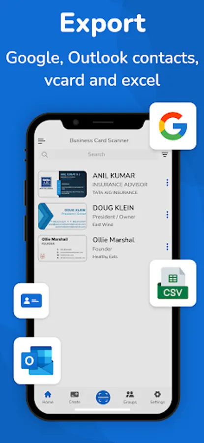 ✓ Virtual business cards and Digital business card scanner to contacts allow you to export contacts to Digital card, Excel CSV, Google Contacts, Outlook Contacts, and Vcards for iPhone