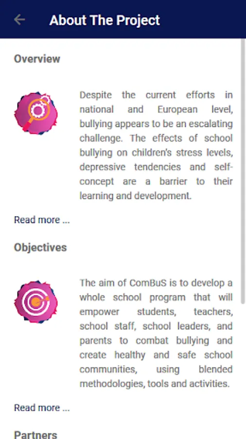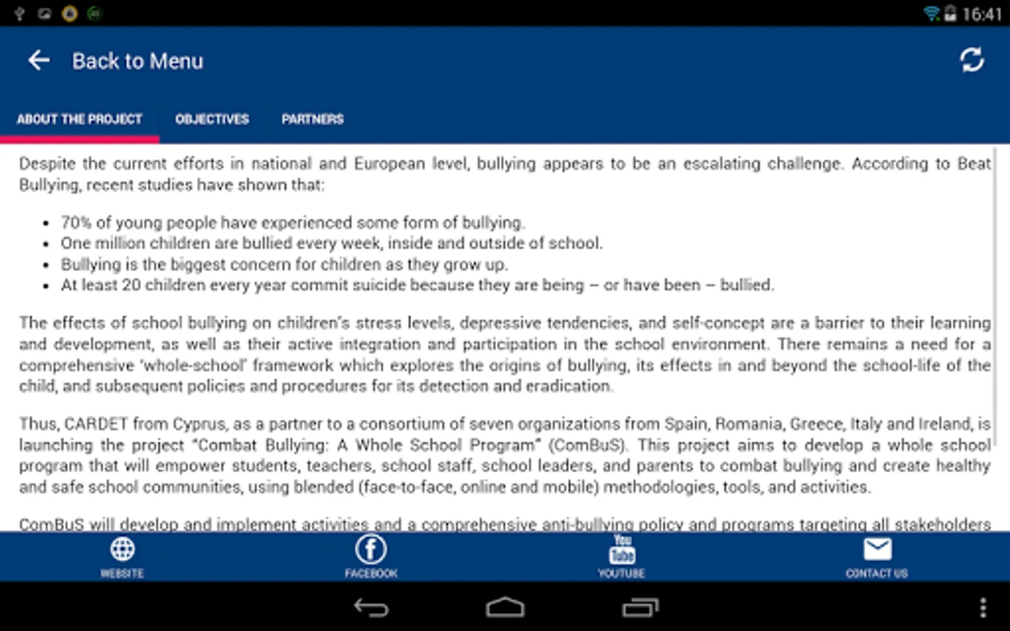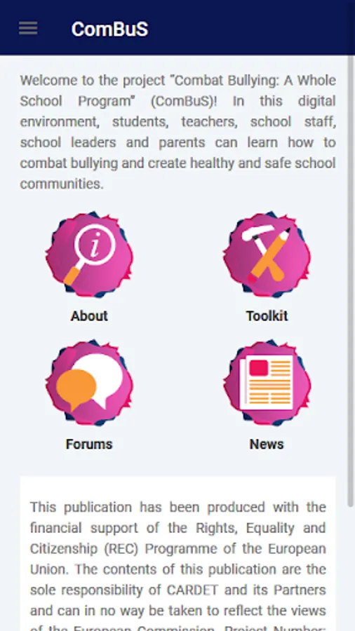 The central aim of the ComBuS is to increase the capacity and raise awareness in combating bullying among the abovementioned target groups, by providing them face-to-face, online and mobile methodologies, tools and activities.