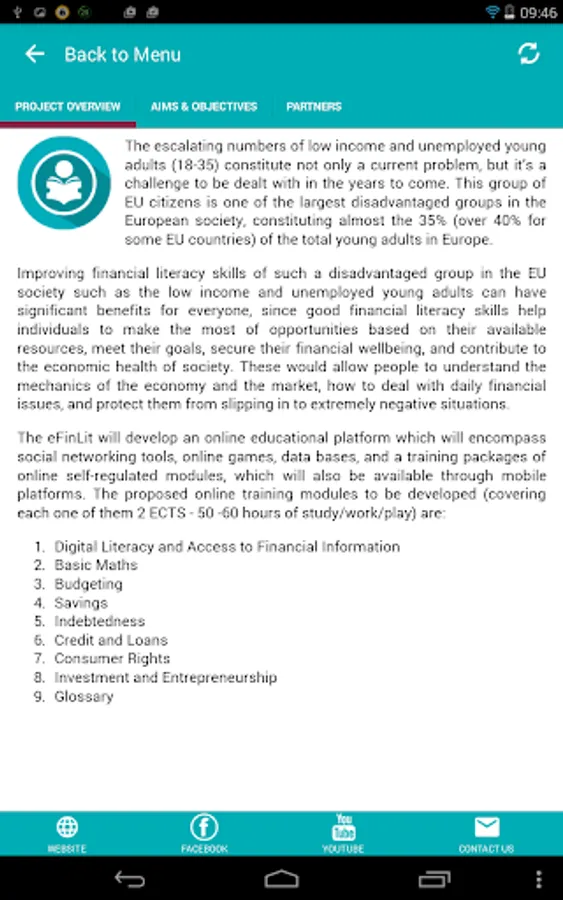 In the current times of economic turbulence and market shortcoming, where the majority of EU citizens are struggling to manage the financial challenges they face, a real life need for the development of their financial literacy competencies has been identified. eFinLit project (Developing Financial Competencies for EU Citizens Utilizing Online Learning and Digital Literacy) aims to promote directly and indirectly the digital numeracy, language, reading, collaboration and communication skills of financial disadvantaged young EU adults (18-35).