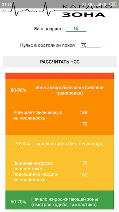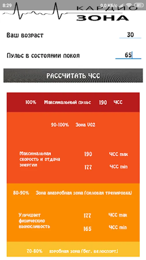 Pulse calculator for various load zones, taking into account age and heart rate in a calm state according to Karvonen formula